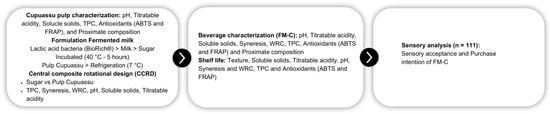 In the first stage, the central composite rotational design (CCRD) was employed for a promising formulation of fermented milk, considering two independent variables: the concentration of added sugar (X1: 0.0–8.6%) and the concentration of cupuassu pulp (X2: 17.2–27.8%) (Table 1). The concentration ranges of sugar and cupuassu pulp were determined in preliminary tests. For sample preparation, the lactic acid bacteria (BioRich®) were homogenized in whole milk in a plastic beaker, and then sugar was added. The mixture was homogenized, packaged in glass bottles, and incubated in a germination chamber (TE-4020 LED, Tecnal, São Paulo, Brazil) at 40 °C for 5 h. After fermentation, cupuassu pulp was incorporated, the beverages were homogenized manually immediately after fermentation, and the samples were stored at 7 °C under refrigeration.