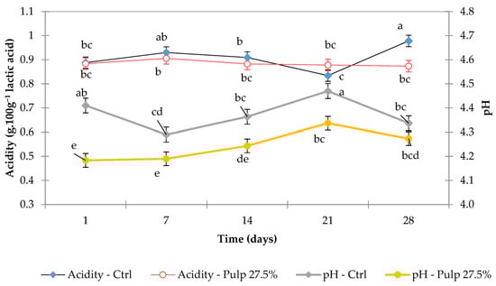 Figure 3 shows the evolution of pH and titratable acidity during the 28 days of storage of the control fermented milk and FM-C (27.5%). The Type III sum of squares indicated that the pH variable had a greater influence on pulp addition than on storage time. The reduction in pH in fermented milk beverages with added pulp is closely associated with the specific properties of cupuassu pulp and to the dynamics of microbial activity during storage [5].