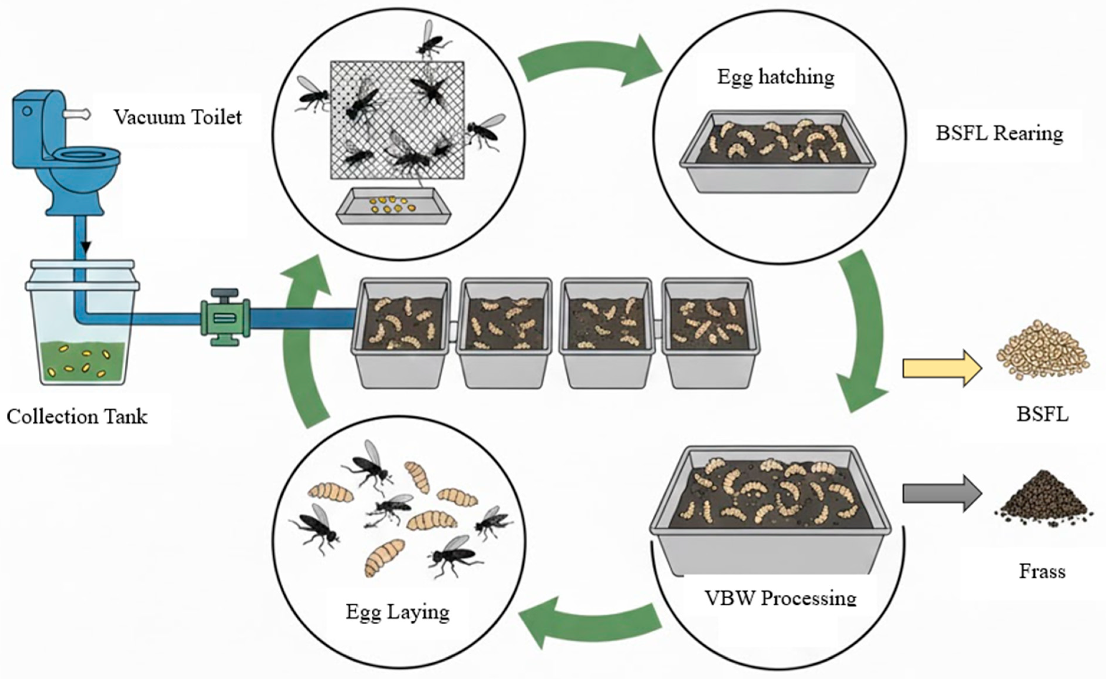 24]. Thus, it is of prime importance that blended waste streams with compatible nutritional profiles are designed to maximize waste diversion and the accumulation of larval biomass. The life cycle of BSFL in VBW treatment is illustrated in