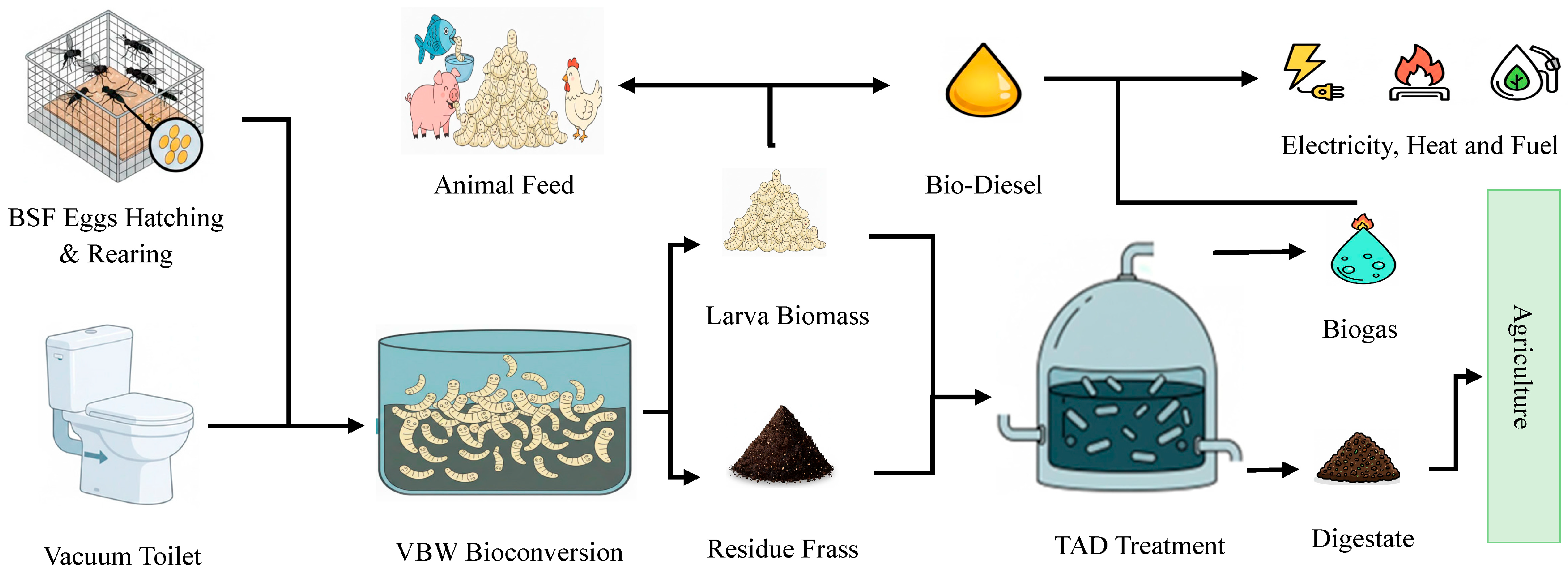 Figure 3 shows a schematic of the co-processing of BSFL bioconversion with TAD for the treatment of VBW.