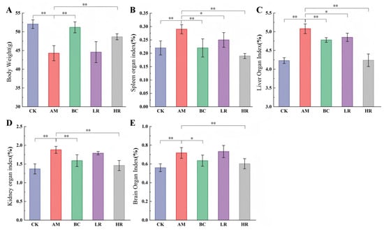 Effects of R. mucilaginosa JAASSRY on Body Weight and Organ Indices in Aging Mice (A) Body weight of mice. (B) Spleen organ index. (C) Liver organ index. (D) Kidney organ index. (E) Brain organ index. (CK: Control group, AM: Model group, BC: β-carotene group, LR: Low-dose R. mucilaginosa JAASSRY group, HR: High-dose R. mucilaginosa JAASSRY group. Compared with the AM group, * p < 0.05, ** p < 0.01).