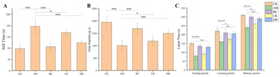 (A) Immobility time in the tail suspension test. (B) Grip impulse. (C) Step-down latency. (CK: Control group, AM: Model group, BC: β-carotene group, LR: Low-dose R. mucilaginosa JAASSRY group, HR: High-dose R. mucilaginosa JAASSRY group. Compared with the AM group, * p < 0.05, ** p < 0.01, *** p < 0.001).