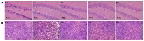 Effects of R. mucilaginosa JAASSRY on Histopathological Structure in Aging Mice (A) Hippocampal tissue H&E-stained section of mice. (B) Splenic tissue H&E-stained section of mice. (CK: Control group, AM: Model group, BC: β-carotene group, LR: Low-dose R. mucilaginosa JAASSRY group, HR: High-dose R. mucilaginosa JAASSRY group).