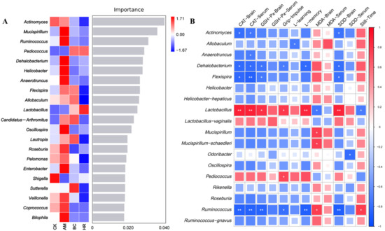 (A) Random forest model analysis of marker genus. Importance on the right side indicates that from top to bottom species are of decreasing importance to the model, and it can be assumed that these genus at the top of the importance scale are marker genus for differences between groups. (B) Spearman correlation analysis between gut microbiota and indicators of oxidative stress and behavioral performance. (CK: Control group, AM: Model group, BC: β-carotene group, HR: High-dose R. mucilaginosa JAASSRY group. Compared with the AM group, * p < 0.05, ** p < 0.01).