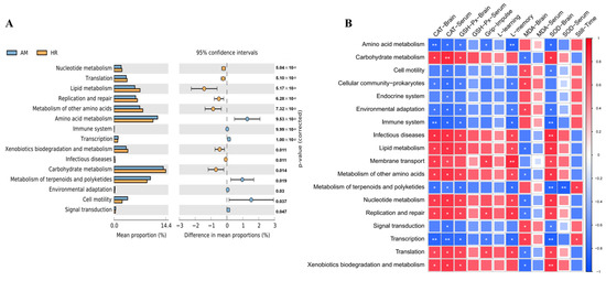 PICRUSt2 was employed to predict the functional potential of the gut microbiota based on the abundance of marker gene sequences in fecal samples. While the overall gene expression levels in primary signaling pathways were similar between the AM and HR groups (Figure A1), significant alterations were observed in secondary signaling pathways. Compared with the AM group, the HR group exhibited increased microbial gene abundances associated with nucleotide metabolism, lipid metabolism, and carbohydrate metabolism (Figure 7A).
