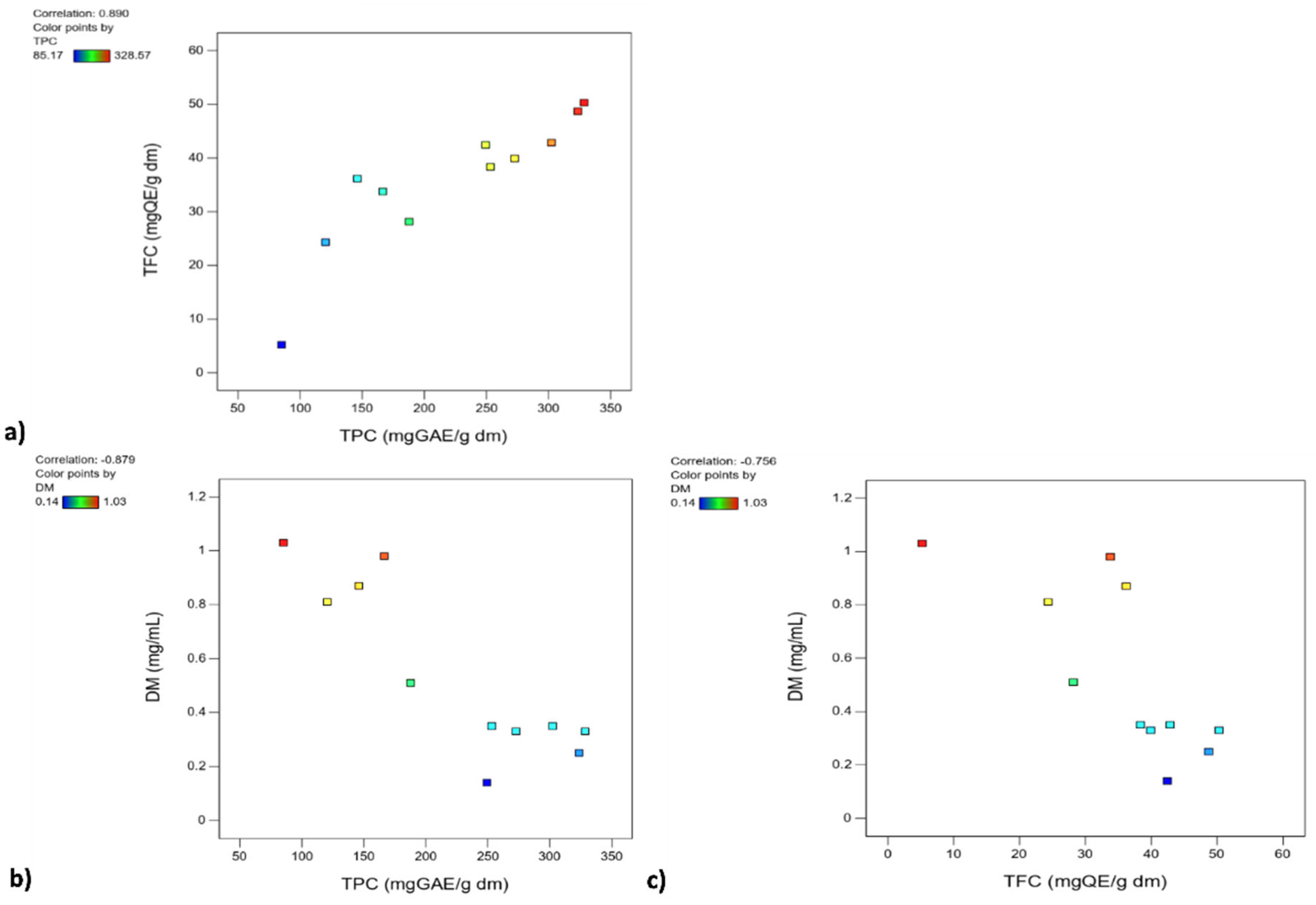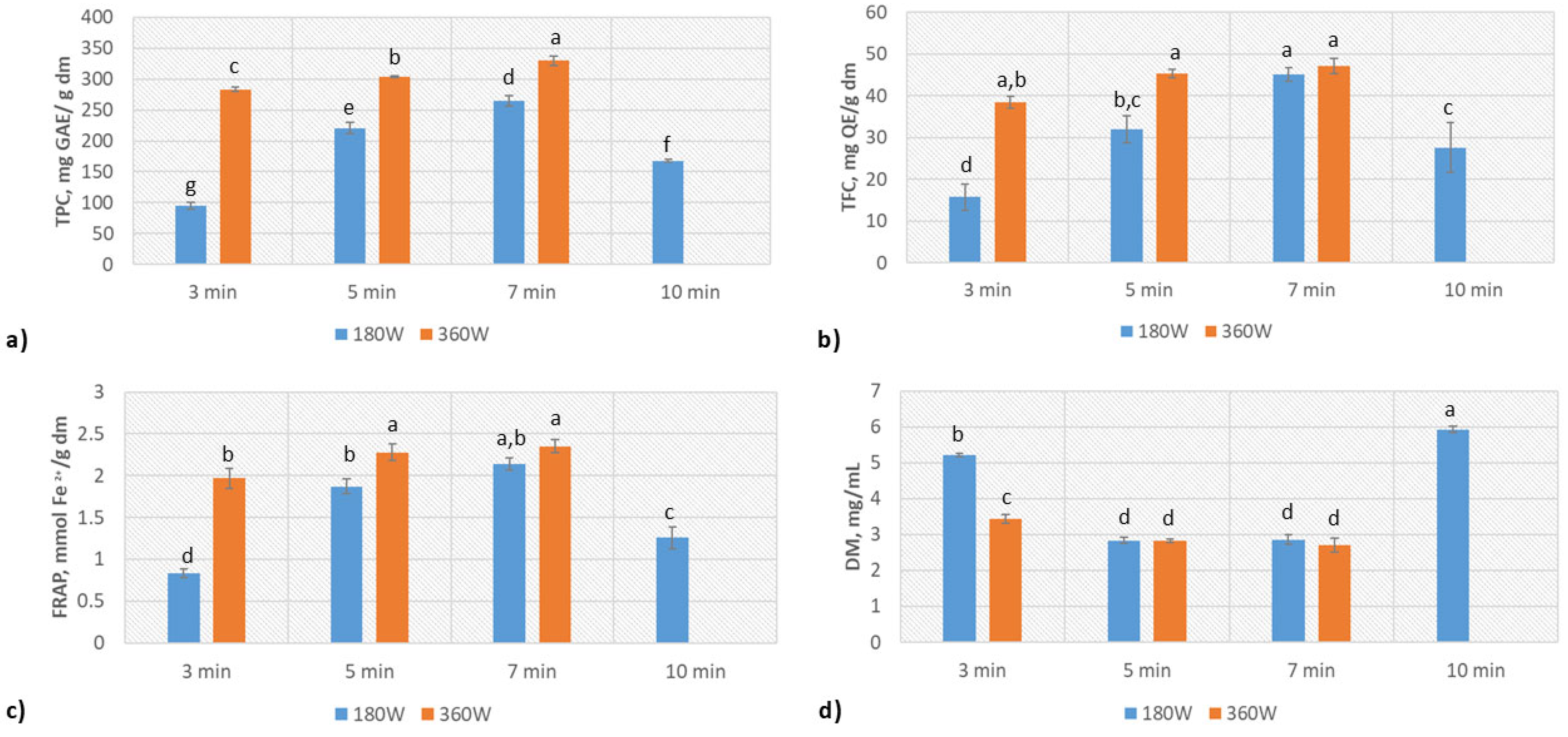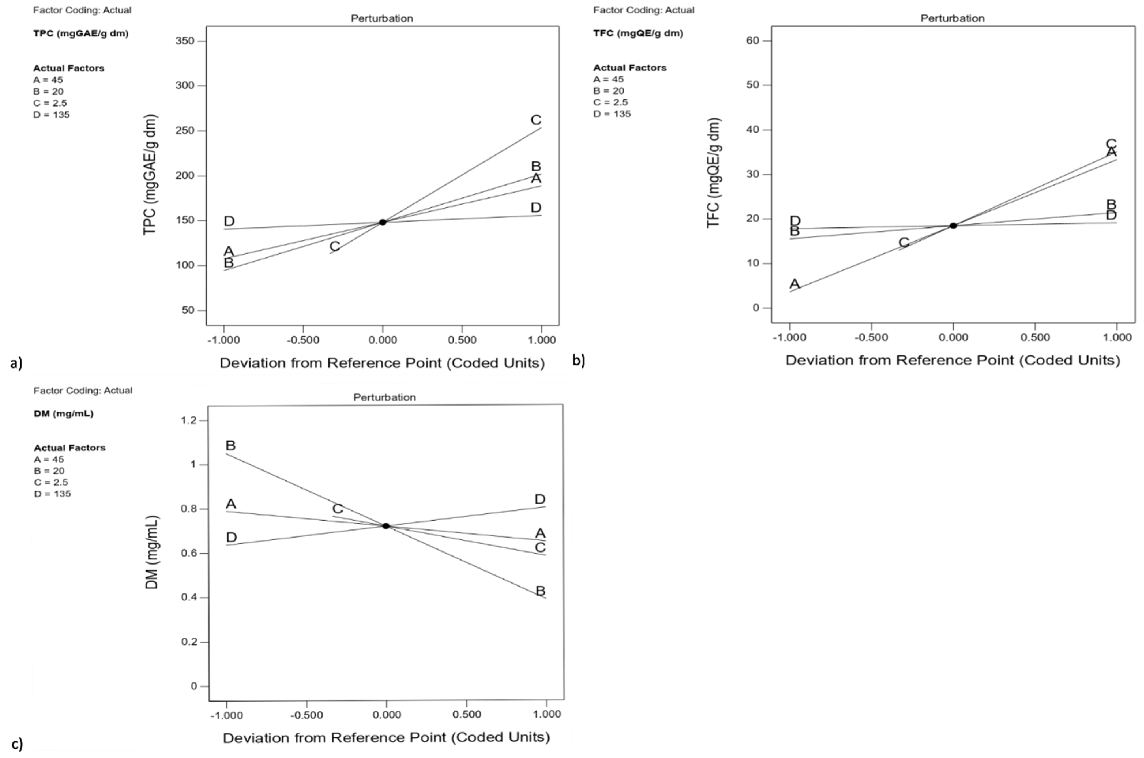 | Sample | A | B | C | D | TPC, mg GAE/g dm | TFC, mg QE/g dm | Dry Matter, mg/mL | FRAP, mmol Fe2+/g dm |