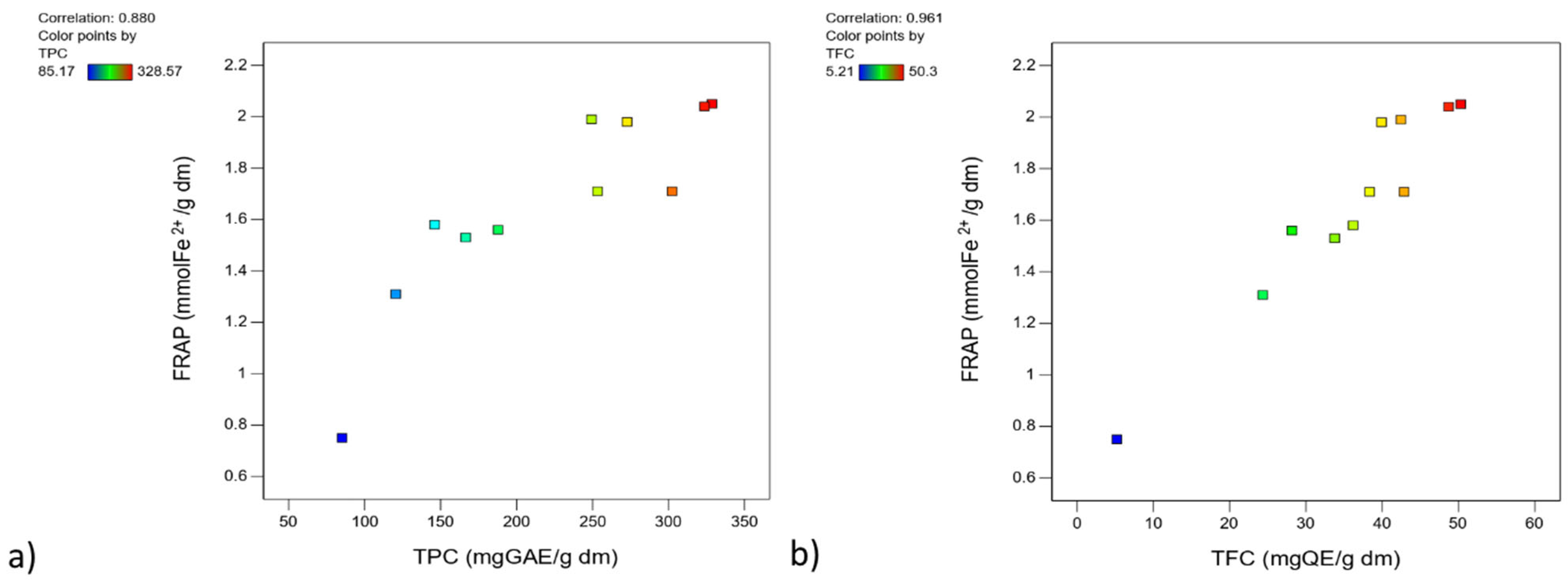 3.1. Influence of Process Parameters on Bioactive Compound Content and Antioxidant Activity in MTS Extracts