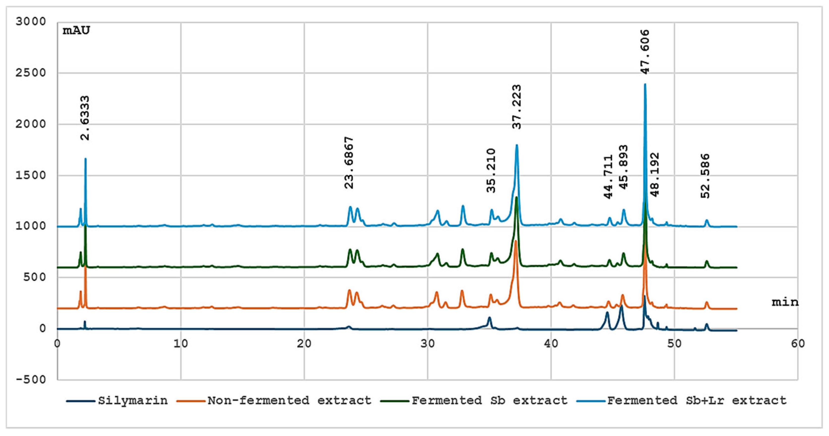 - Amini, A.; Mousavi, Z.E.; Mousavi, S.M. Biological transformation of herbal extracts through Lactic Acid Bacteria fermentation: A study on Milk thistle and liquorice root extract. Food Biosci. 2024, 62, 105105. [Google Scholar] [CrossRef]