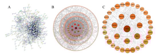 Protein–protein interaction (PPI) networks. (A) PPI network based on the STRING database; (B) PPI network constructed via Cytoscape 3.9.1; (C) PPI network of common core targets between COFs and ALI. ( Larger node size, darker color, and thicker connecting lines indicate higher importance of the node in the network in (B,C)).