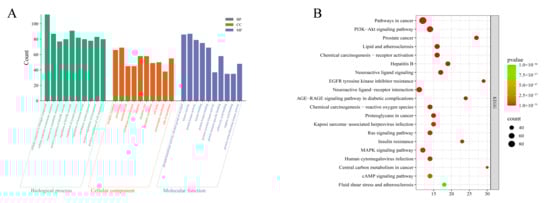 GO enrichment analysis and KEGG pathway enrichment analysis (A) bar chart of biological process (BP), cellular component (CC), and molecular function (MF) enrichment; (B) bubble chart of KEGG pathway enrichment.