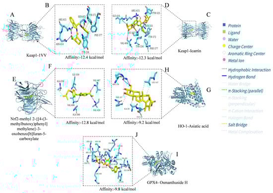 Visualization analysis results of docking between icariin, methyl 2-{[4-(3-methylbutoxy) phenyl]methylene}-3-oxobenzo[b]furan-5-carboxylate, Asiatic acid, and osmanthuside H and the Keap1, Nrf2, HO-1, and GPX4 proteins. (A) 1vv embedded in the binding pocket of key target Keap1; (B) Binding status of 1vv with amino acid residues of 4L7B; (C) Icarrin embedded in the binding pocket of key target Keap1; (D) Binding status of Icarrin with amino acid residues of 4L7B; (E) Methyl 2-{[4-(3-methylbutoxy)phenyl]methylene}-3-oxobenzo[b]furan-5-carboxy late embedded in the binding pocket of key target Nrf2; (F) Binding status of methyl 2-{[4-(3-methylbutoxy) phenyl]methylene}-3-oxobenzo[b]furan-5-carboxylate with amino acid residues of 7K2L; (G) Asiatic acid embedded in the binding pocket of key target HO-1; (H) Binding status of Asiatic acid with amino acid residues of 5BTQ; (I) Osmanthuside H embedded in the binding pocket of key target GPX4; (J) Binding status of osmanthuside H with amino acid residues of 2HGS. The compound structures are displayed as yellow stick models, and the amino acid residues are displayed as blue stick models. Hydrogen bonds, hydrophobic interactions, and salt bridges are represented by blue solid lines, gray dashed lines, and yellow dashed lines, respectively.