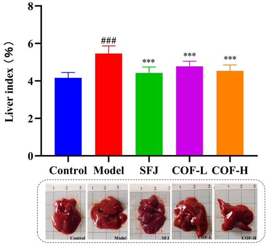 The liver index can reflect the degree of liver swelling and injury, and hepatomegaly is a clinically common symptom of alcoholic liver injury [37]. As shown in Figure 6, the liver indices of the model group were significantly greater than those of the control group, indicating that excessive alcohol intake induced hepatomegaly and that the liver injury model was successfully established. Compared with that in the model group, the liver index was significantly lower in both the SFJ group and the COF group, demonstrating that COF could effectively alleviate alcohol-induced hepatomegaly. These results suggest that both SFJ and COF ameliorate alcohol-induced liver injury in mice.
