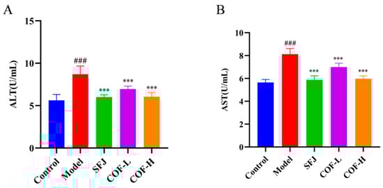 Effects of COF on serum ALT and AST levels in mice. (A) Serum ALT activity; (B) serum AST activity. All data are expressed as the mean ± standard deviation (SD). Differences between groups were analyzed using one-way analysis of variance (ANOVA), followed by the least significant difference (LSD) test for post hoc multiple comparisons. Compared with the control group: ### p < 0.001; compared with the model group: *** p < 0.001.