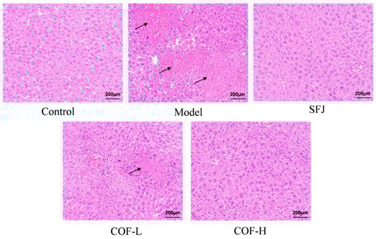 In contrast to that in the model group, liver tissue damage was improved to varying degrees in all the drug-treated groups. Specifically, in the SFJ group and COF-H group, hepatocytes were arranged relatively tightly, inflammatory cell infiltration was significantly reduced, and a small number of tiny vacuoles were observed in the cytoplasm. In the COF-L group, a small amount of inflammatory cell infiltration was still observed, and some hepatocytes retained nuclear fragmentation and karyolysis with slightly irregular cell morphology; no other significant abnormalities were found.