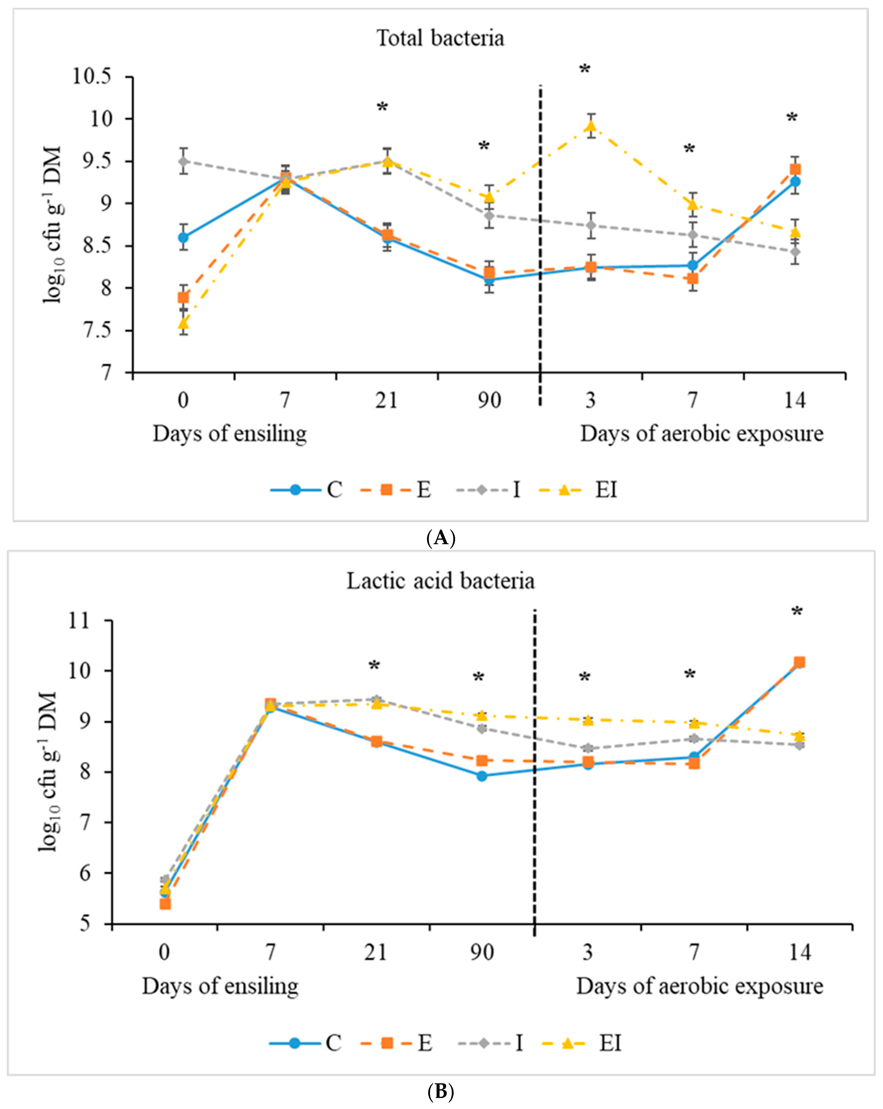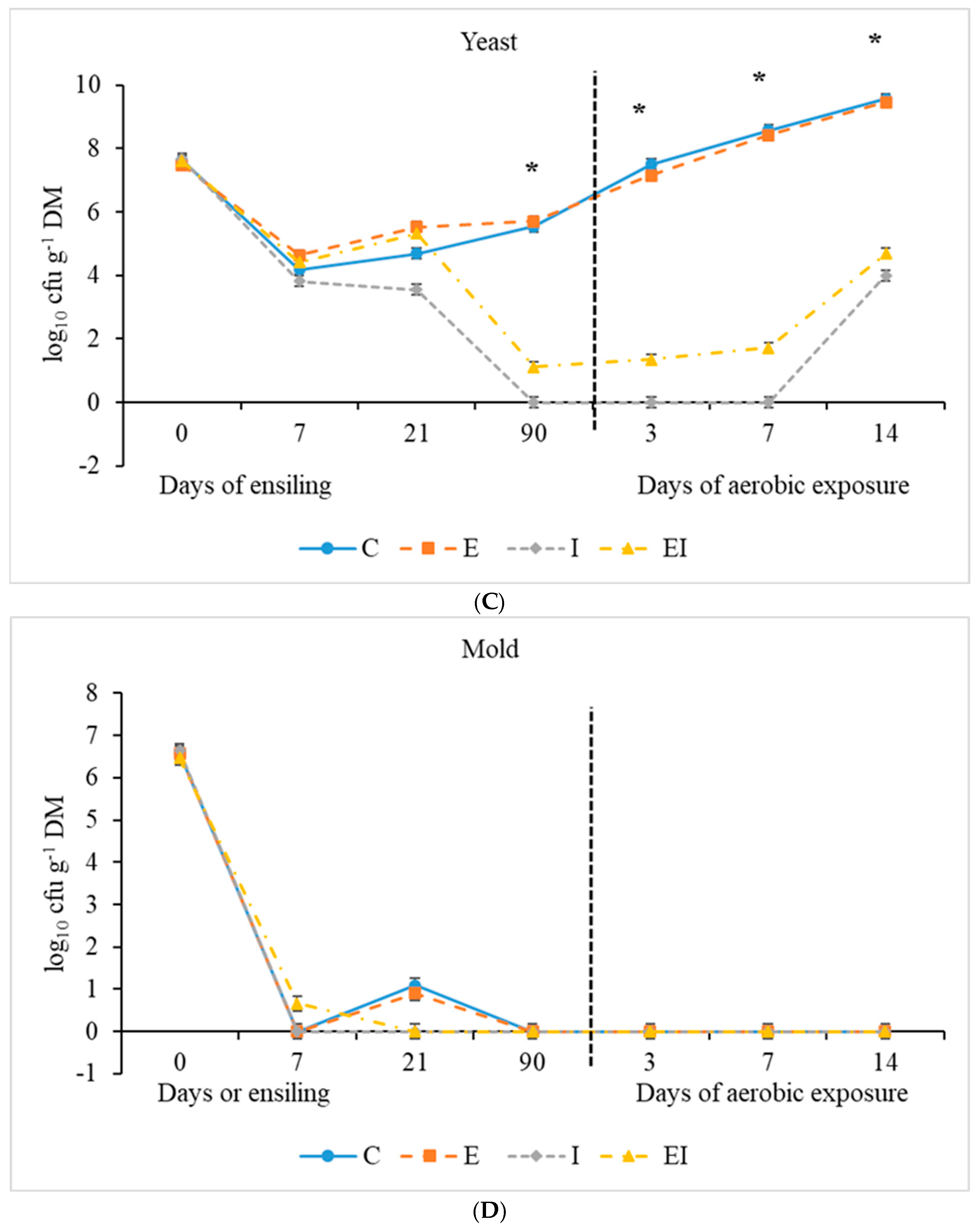 - Nair, J.; Yang, H.-E.; Redman, A.-A.; Chevaux, E.; Drouin, P.; McAllister, T.A.; Wang, Y. Effects of a mixture of Lentilactobacillus hilgardii, Lentilactobacillus buchneri, Pediococcus pentosaceus and fibrolytic enzymes on silage fermentation, aerobic stability and performance of growing beef cattle. Tans. Anim. Sci. 2022, 6, txac144. [Google Scholar] [CrossRef]