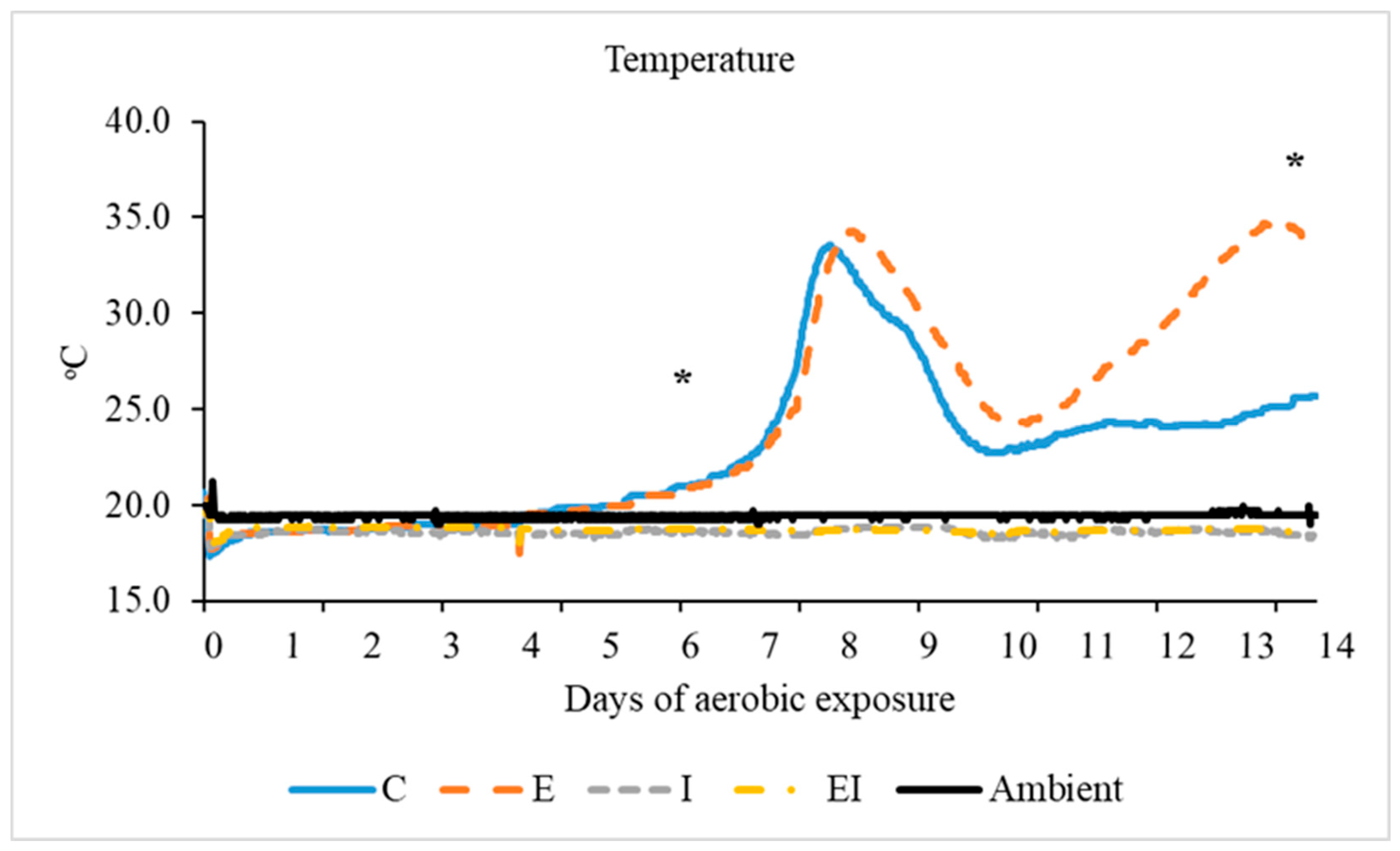 - Ferrero, F.; Tabacco, E.; Piano, S.; Casale, M. Temperature during conservation in laboratory silos affects fermentation profile and aerobic stability of corn silage treated with Lactobacillus buchneri, Lactobacillus hilgardii, and their combination. J. Dairy Sci. 2021, 104, 1696–1713. [Google Scholar] [CrossRef]