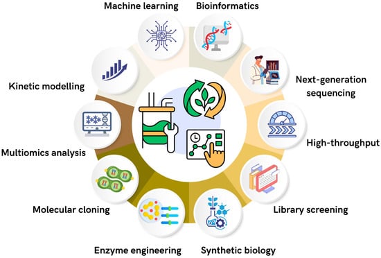 Simultaneously, synthetic biology expands the potential of these strategies by enabling the design and construction of artificial genetic circuits using modern tools such as CRISPR–Cas9, MAGE (Multiplex Automated Genome Engineering), and comprehensive “omics” platforms (genomics, transcriptomics, proteomics, and metabolomics). This integration has facilitated the development of highly efficient microorganisms capable of converting renewable feedstocks into biofuels in a more economical, scalable, and environmentally sustainable manner [18,26].
