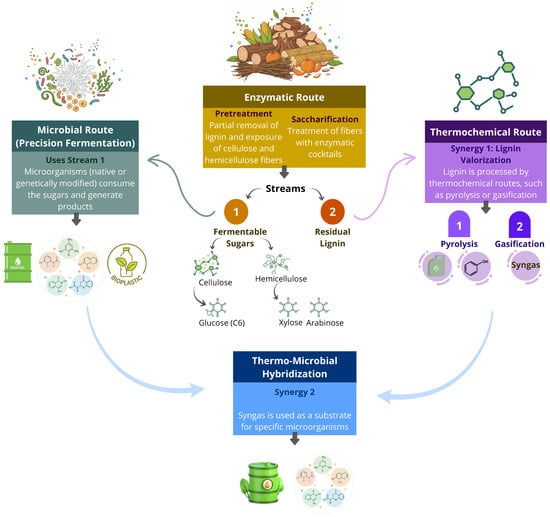 Precision fermentation (PF) and metabolic engineering emerge as promising strategies to accelerate the development of bioenergy, expanding microbial bioconversion beyond advanced alcohols to include syngas-derived fuels and biohydrogen as strategic energy carriers [14,15,16,17]. In this scenario, wild microorganisms, naturally limited by low productivity and inefficient regulation, can be enhanced through the insertion of specific genes, enabling the simultaneous utilization of C5 and C6 sugars, increasing tolerance to inhibitory compounds, and improved titer, rate, and yield (TRY) [18,19,20,21,22,23,24,25].