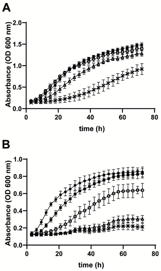 Effect of different CB-839 concentrations on the growth rate of R. mucilaginosa cultured in (A) MS or (B) Gln-NB. Experimental conditions, same as in Figure 3, except that increasing concentrations of CB-839 were added to the growth medium. Rhodotorula mucilaginosa growth in (A) MS or (B) Gln-NB. No additions (•); DMSO alone (■); 0.05 mM cb-839 (O); 0.3 mM CB-839 (Δ).