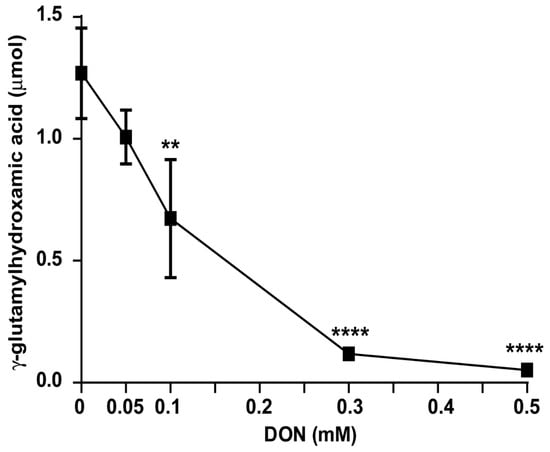 Effect of DON on the R. mucilaginosa glutaminase activity. Cells were grown 24 h and harvested as indicated in the methods. Cell homogenates were prepared and incubated with increasing concentrations of DON in DMSO. The solvent was always adjusted to 20 µL DMSO/Tris mL; additionally, DMSO was also included in the control. n = 3. Significant difference against the control p-value: ** 0.60; **** 1.15.