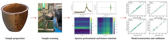For this reason, the performance of an NIR model is significantly enhanced by incorporating diverse samples that cover a wider quality range. In food fermentation applications, enhancing model performance entails selecting samples that represent variations in crucial factors such as raw material composition, microbial metabolic activity, fermentation stage, and end-product characteristics. These variations are best captured by a sample set that encompasses different raw material batches, fermentation time points, process parameters (e.g., temperature, pH, dissolved oxygen), and manufacturing lots. The resulting diversity within the sample set substantially strengthens the model’s reliability and applicability across varying fermentation conditions and production scales. The calibration set must encompass the entire expected range of the target indicators (e.g., substrate concentration, cell density, metabolite content). Its broad representativeness forms the foundation for the model’s robust generalization capability. In contrast, the validation set should consist of samples entirely independent of the calibration set, with the best practice being to collect them from different manufacturing lots or time points. This setup ensures the validation set effectively simulates the variability encountered in real-world applications, thereby providing an objective and unbiased assessment of the model’s predictive performance [22]. Many studies recommend that the calibration set should include at least 150–200 samples to ensure adequate model robustness and generalization [27,28,29]. Additionally, it is common practice to allocate approximately 20–30% of the total dataset to the validation set to ensure a reliable assessment of model performance [30,31]. The multivariate chemometric analysis of spectroscopic data involves several essential steps, ranging from spectral pretreatment and dimensionality reduction to feature selection, calibration model development, and validation [22], the flowchart is illustrated in Figure 2 This flow represents the fundamental workflow for building an NIR spectroscopic prediction model.