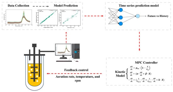 Food Fermentation processes exhibit significant nonlinear and time-delay characteristics. This means that the full impact of current manipulated variables, such as temperature and aeration rate, on key quality parameters like final product concentration will only manifest after a certain time delay. As such, relying solely on real-time feedback control is often insufficient for effective operation. In contrast, Model Predictive Control (MPC), as an advanced control strategy, is well-suited to address this challenge [79]. A soft sensor model can be developed based on NIR spectroscopy to estimate key quality variables in fermentation processes. This model utilizes easily accessible, real-time spectral data to infer or predict critical parameters that are difficult to measure online directly. The MPC controller leverages this process model together with the real-time predictions from the soft sensor. It not only considers the current system state but also anticipates process dynamics over a future horizon. Subsequently, an optimization algorithm computes a sequence of optimal adjustments to the manipulated variables, aiming to drive the predicted outputs as close as possible to the desired trajectory while satisfying all operational constraints (Figure 3). Schenk et al. investigated the application of economic nonlinear model predictive control in wine fermentation to optimize cooling energy consumption [80]. By employing an improved fermentation kinetic model integrated with parameter and state estimation, the strategy enabled real-time adjustment of the temperature control policy. Experiments conducted at Dienstleistungszentrum LandlicherRaum Mosel compared the traditional industrial controller with the MPC strategy. Results demonstrated that the MPC approach reduced energy consumption by approximately 52% without compromising wine quality and even achieved a superior flavor profile. This case confirms the effectiveness and economic benefits of MPC in nonlinear bioprocesses. Although the cited study did not explicitly employ NIR spectroscopy for monitoring sugar and ethanol levels, NIR spectroscopy is already capable of enabling in situ, real-time monitoring and prediction of these critical parameters [33,34]. This provides high-frequency, highly reliable feedback data for MPC, significantly improving the timeliness and accuracy of state and parameter estimation. Furthermore, emerging spectroscopic techniques, such as Raman spectroscopy, have considerable potential for non-destructive, dynamic tracking of microbial biomass and metabolic activity [81]. By integrating NIR or Raman or other spectroscopy information, it becomes feasible to construct a comprehensive process perception system that encompasses substrate consumption, product formation, and microbial status. Such integration would establish a robust data foundation and expanded optimization space, enabling more precise and highly adaptive MPC strategies for food fermentation processes. The effectiveness of MPC strategies is highly dependent on the accuracy of the process model and the timeliness of state estimation. Traditional mechanistic or linear statistical models often face limitations in predictive capability when dealing with the strong nonlinearity and batch-to-batch variations inherent in fermentation processes. This is precisely where artificial intelligence technologies can play a crucial role. Data-driven AI models, represented by deep learning, can directly learn and characterize complex nonlinear dynamic relationships from vast amounts of historical NIR spectral data and process parameters, thereby constructing more accurate prediction models than traditional methods. Such a fused “NIR-AI” soft sensor model can serve as a superior process model within MPC, significantly enhancing its ability to predict future states and making control decisions more proactive and precise. Furthermore, artificial intelligence can be applied to optimize the core components of MPC itself. For example, reinforcement learning algorithms can interactively learn with a process model (or a digital twin) to autonomously explore and discover optimal control strategies. They can even adapt to complex objectives that are difficult to describe with precise mathematical models, such as achieving the “optimal flavor profile.” This marks an evolution of control strategies from model-based optimization toward AI-enabled autonomous learning.