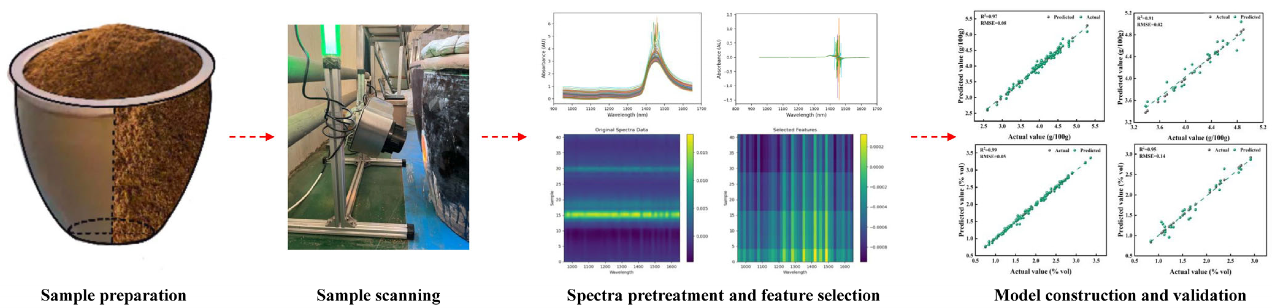 - Zhang, N.; Li, Z.H.; Huang, X.W.; Shi, J.Y.; Zou, X.B.; Zhang, S.Y.; Shen, C.H.; Wang, S.T.; Hu, Y.X.; Wang, Q. NIR-based chemometric modeling for fermentation round classification and physicochemical indicator prediction during stacking fer-mentation of sauce-flavor Baijiu. Food Biosci. 2025, 73, 107680. [Google Scholar] [CrossRef]
