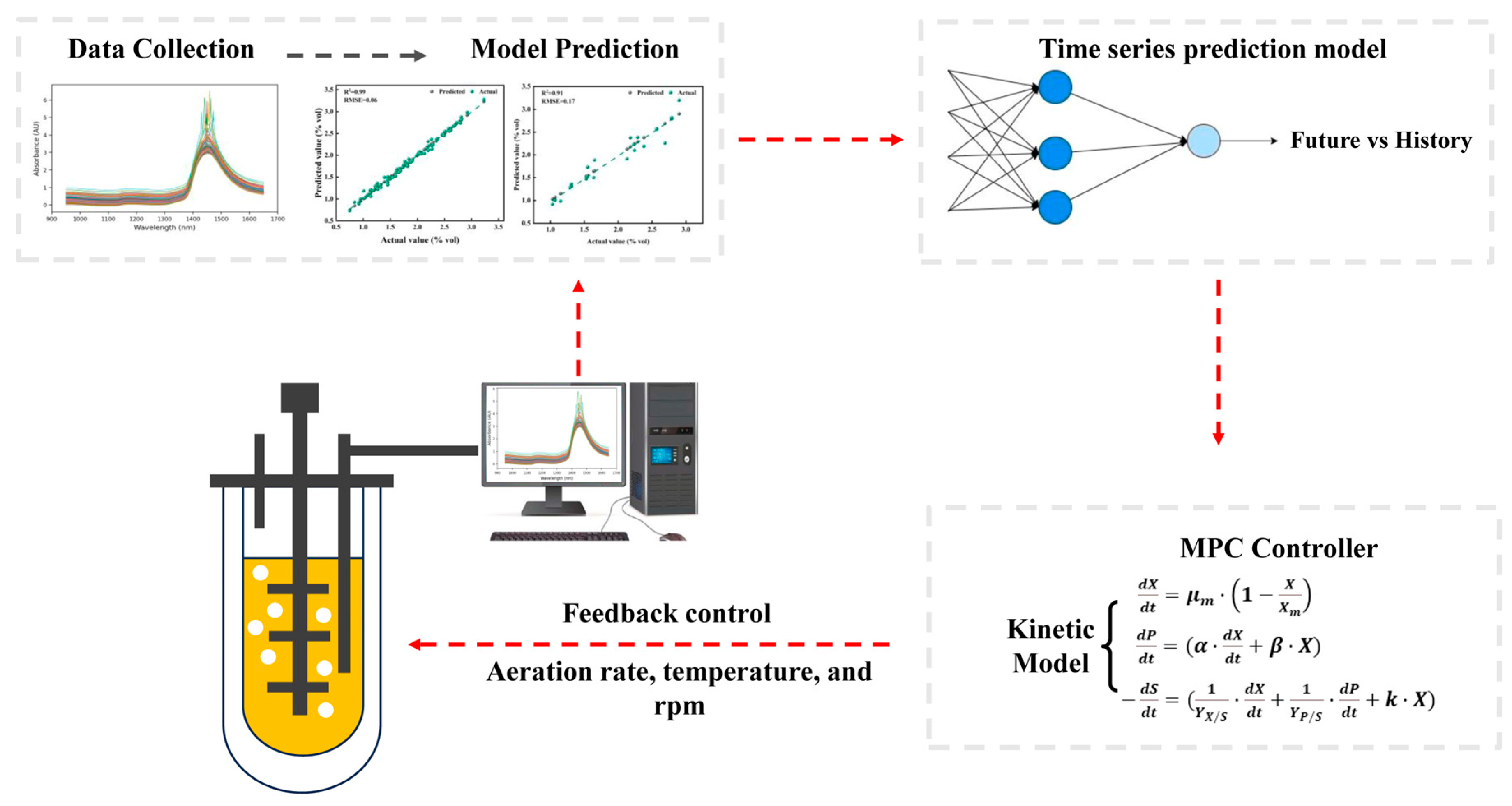 - Chandrasekaran, K.; Chandrasekaran, K.; Jayaraman, G.; Bhatt, N. Model maintenance, monitoring, and control framework using In-Situ NIR spectroscopy and offline process data for Lactococcus lactis fermentation. Chem. Eng. J. 2025, 519, 165116. [Google Scholar] [CrossRef]