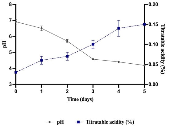 The titratable acidity was carried out according to the methodology of the AOAC (2000 [30]) (N° 942.15); readings were taken every twenty-four hours.