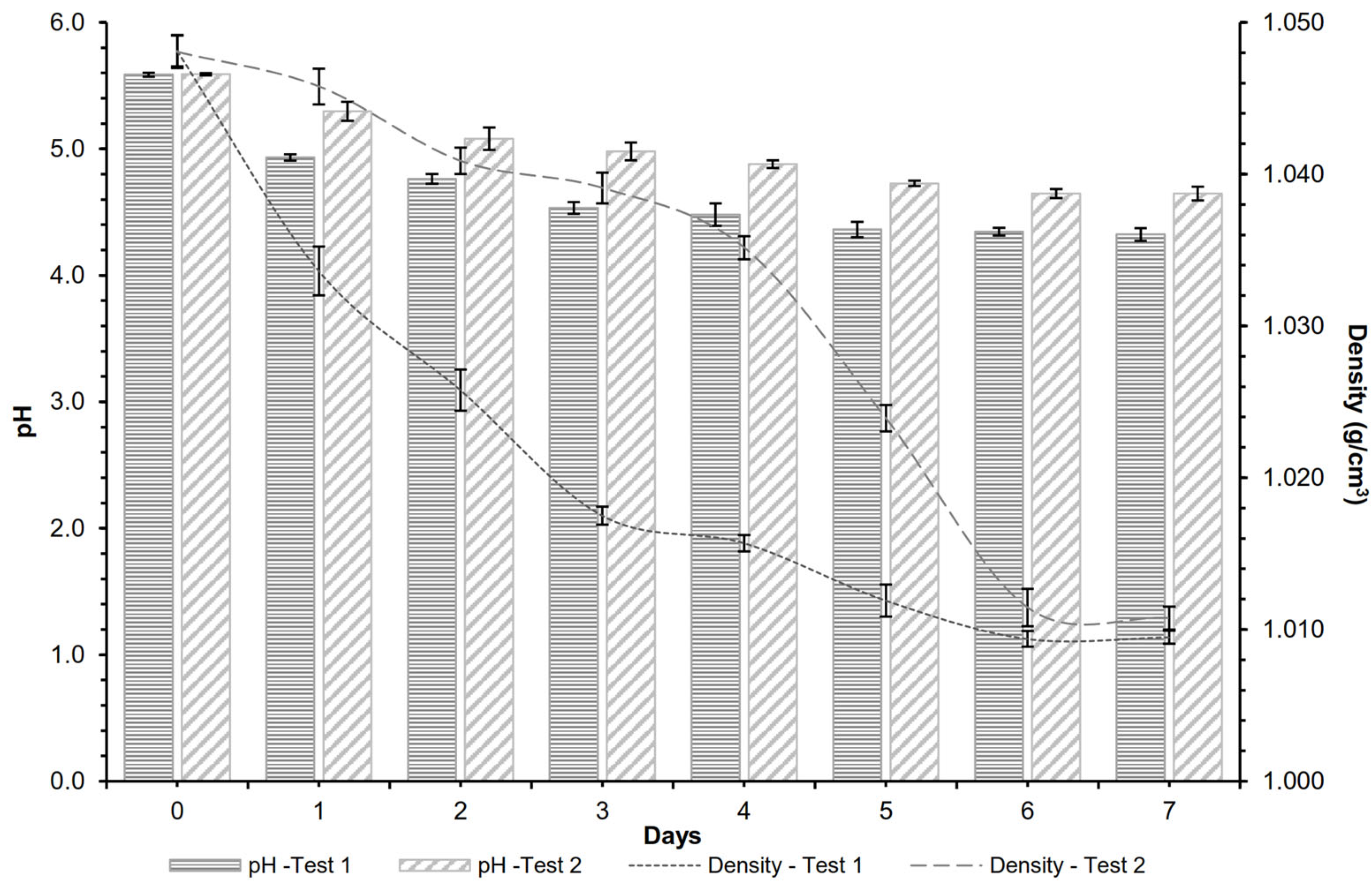 | Test 1 | S. cerevisiae | 7.15 ± 0.15 c | 7.88 ± 0.20 a | 7.86 ± 0.25 a | 7.52 ± 0.13 b |