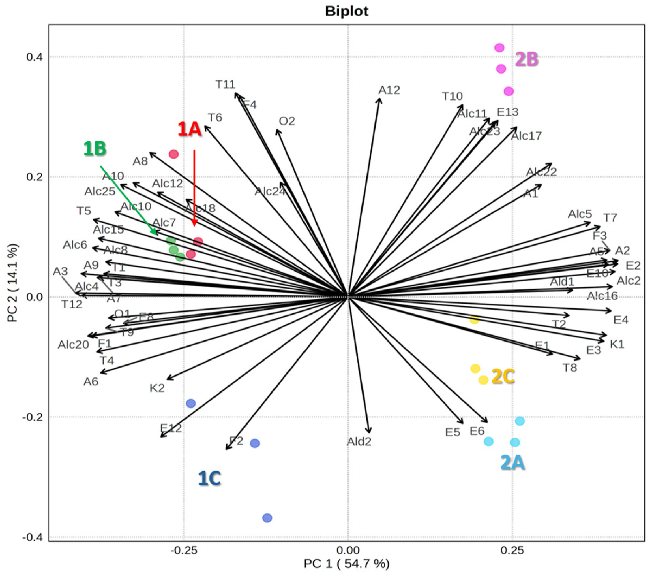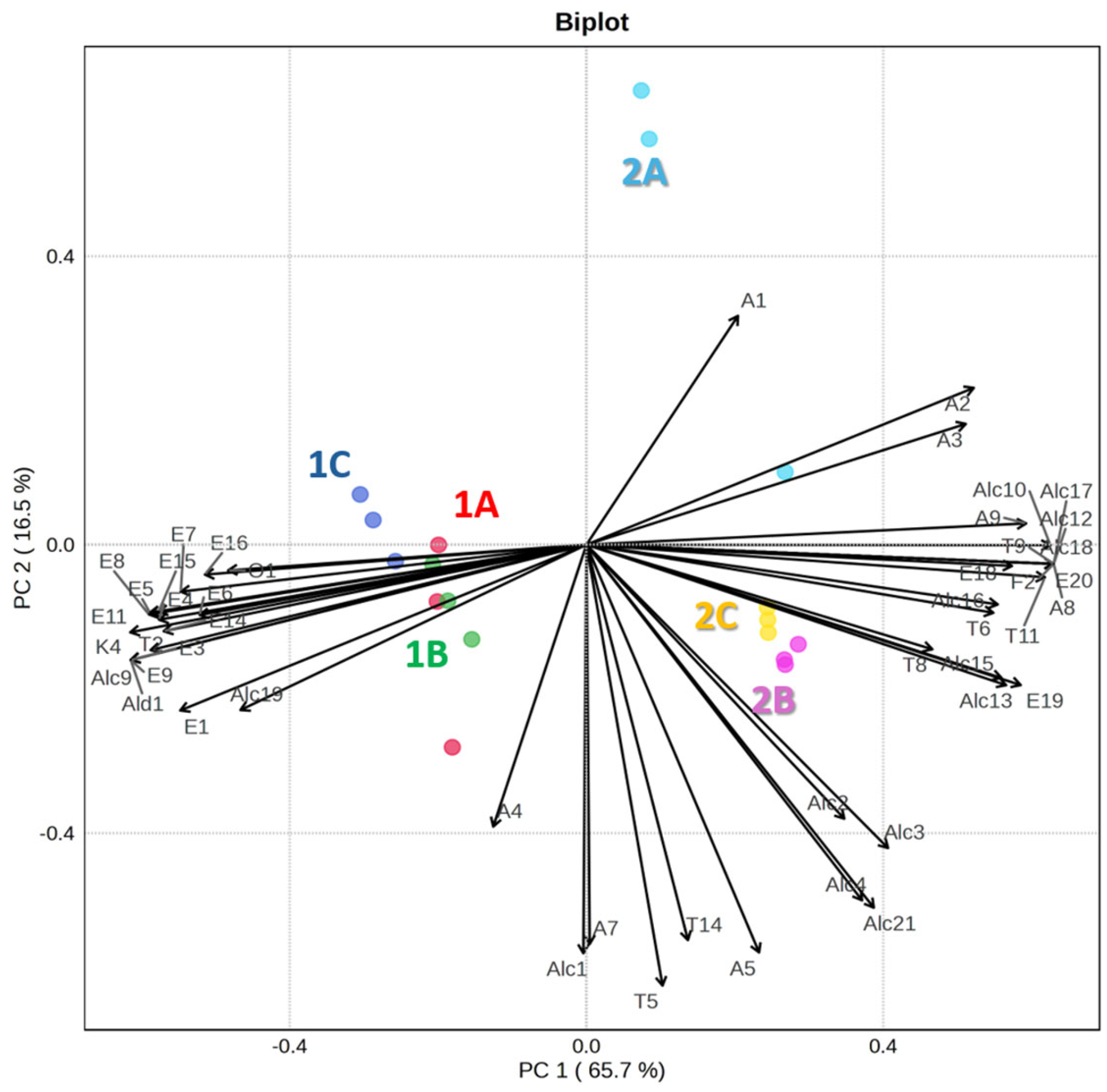 | Ethanol | Alc1 | 934 | 52.70 ± 2.22 | 50.77 ± 2.18 | RI/MS/S |