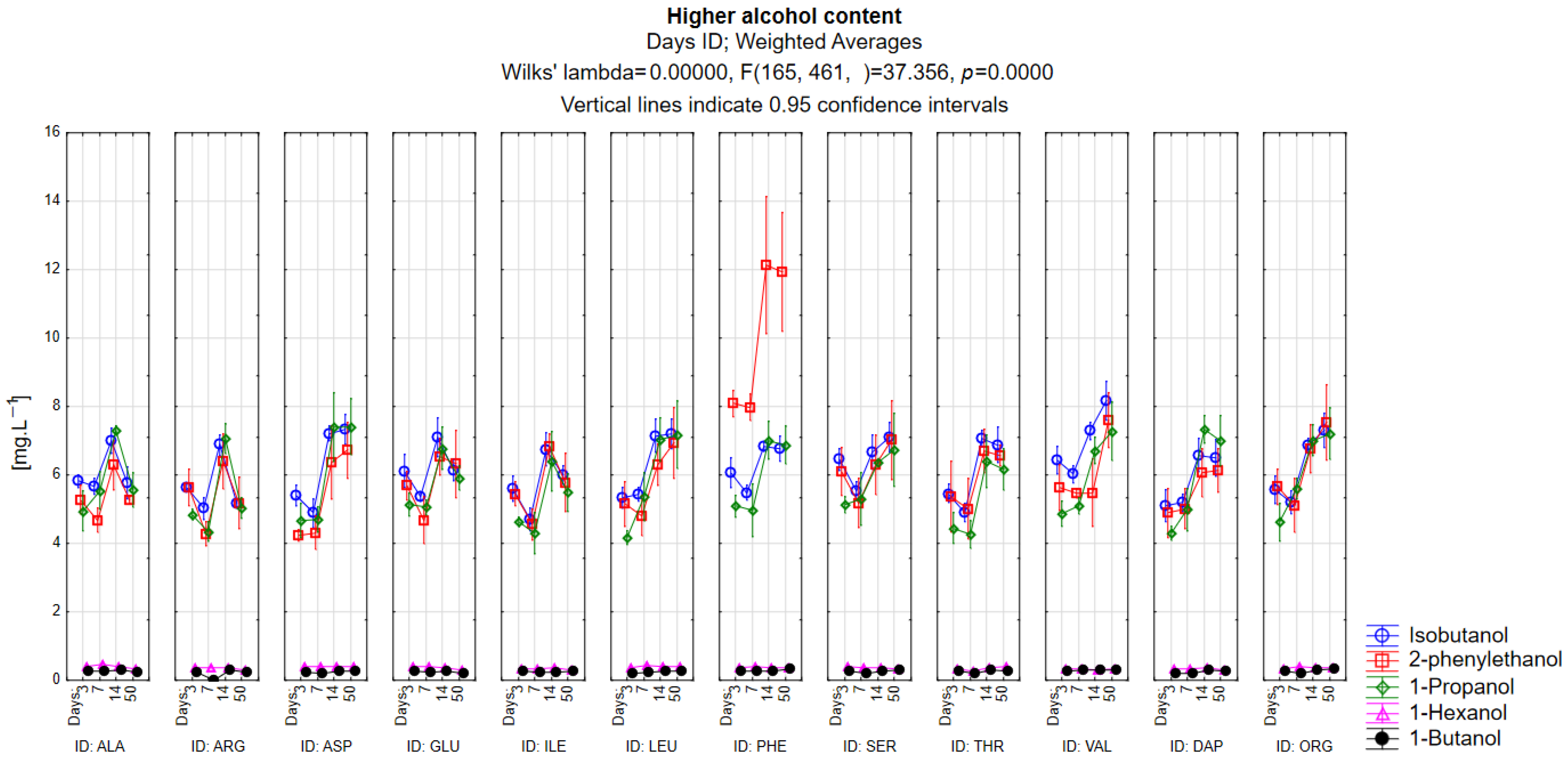 p < 0.05), confirming its strong precursor-driven effect. The precursor for the higher alcohol 1-propanol is the amino acid threonine, but this variant does not show an increased concentration of the higher alcohol 1-propanol. On the contrary, it was most abundant in the variants with aspartic acid, leucine, serine, and controls that contained all the amino acids. However, the LSD test shows that only a few pairs (e.g., asparagin–valin or leucin–ogranic nutrition) did not differ significantly, while most other combinations were statistically different (