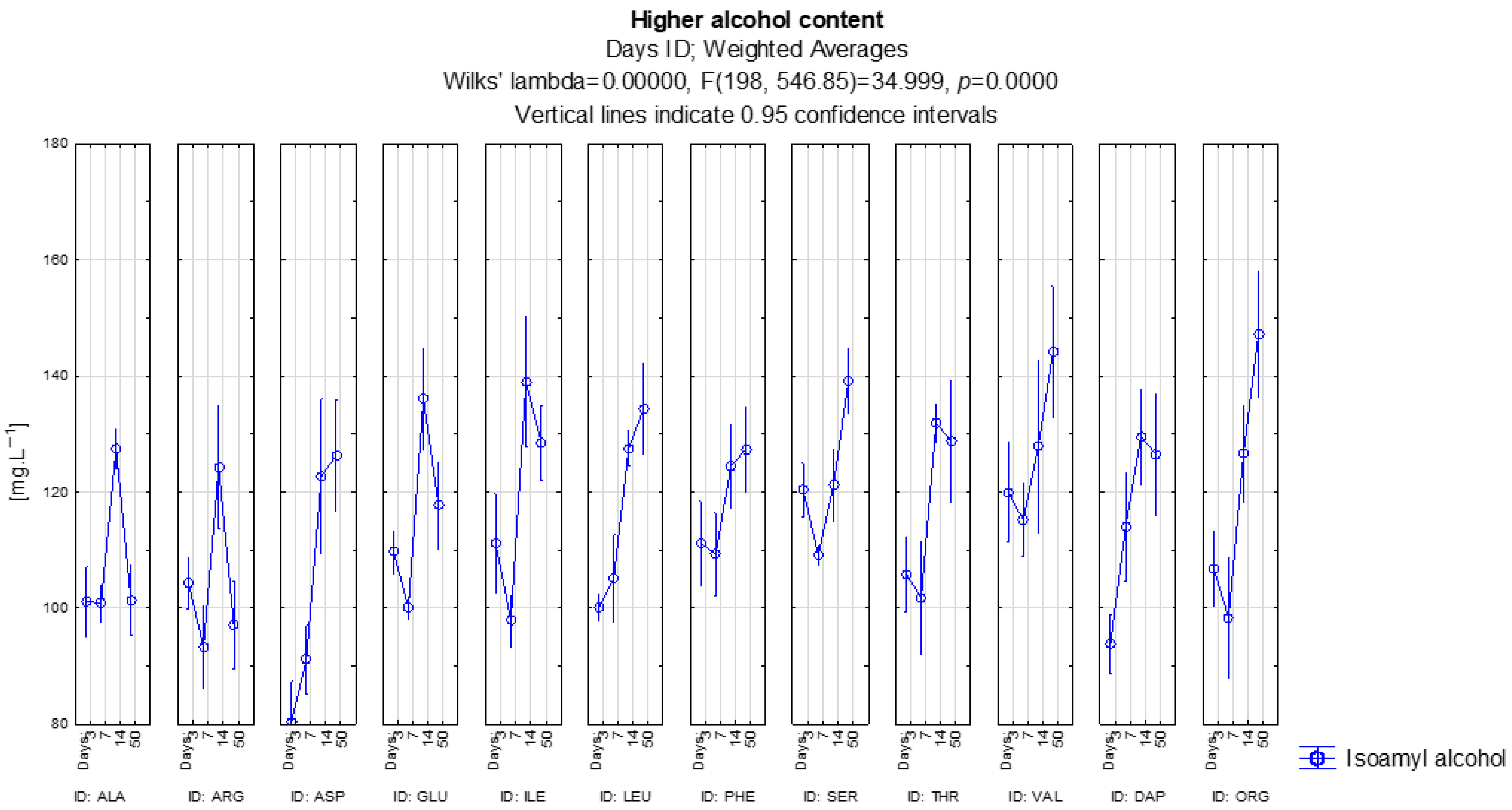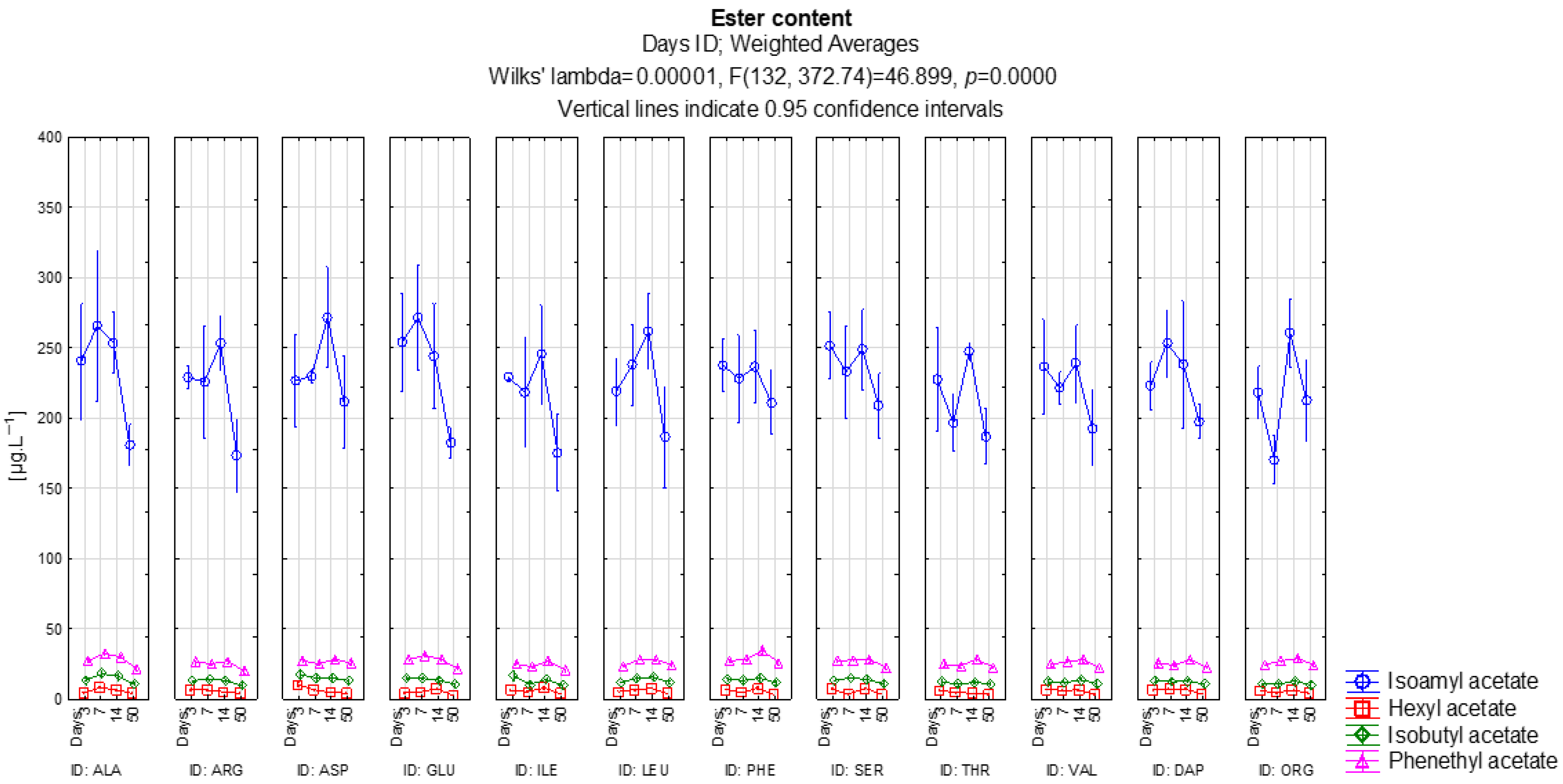 Table 11 it is evident that the differences between the individual amino acids are not as clear as those found with other substances, statistically insignificant values appear for a number of combinations. For example, ALA50 and GLU50 or ARG50 and ILE50 behave in a similar way, where the differences were not confirmed statistically. On the contrary, variants such as ASP50, PHE50 and SER50 are clearly different from most other variants and demonstrate a specific effect on the production of this ester. Overall, the test shows that while some amino acids have a very similar effect, others significantly stand out and form separate profiles.