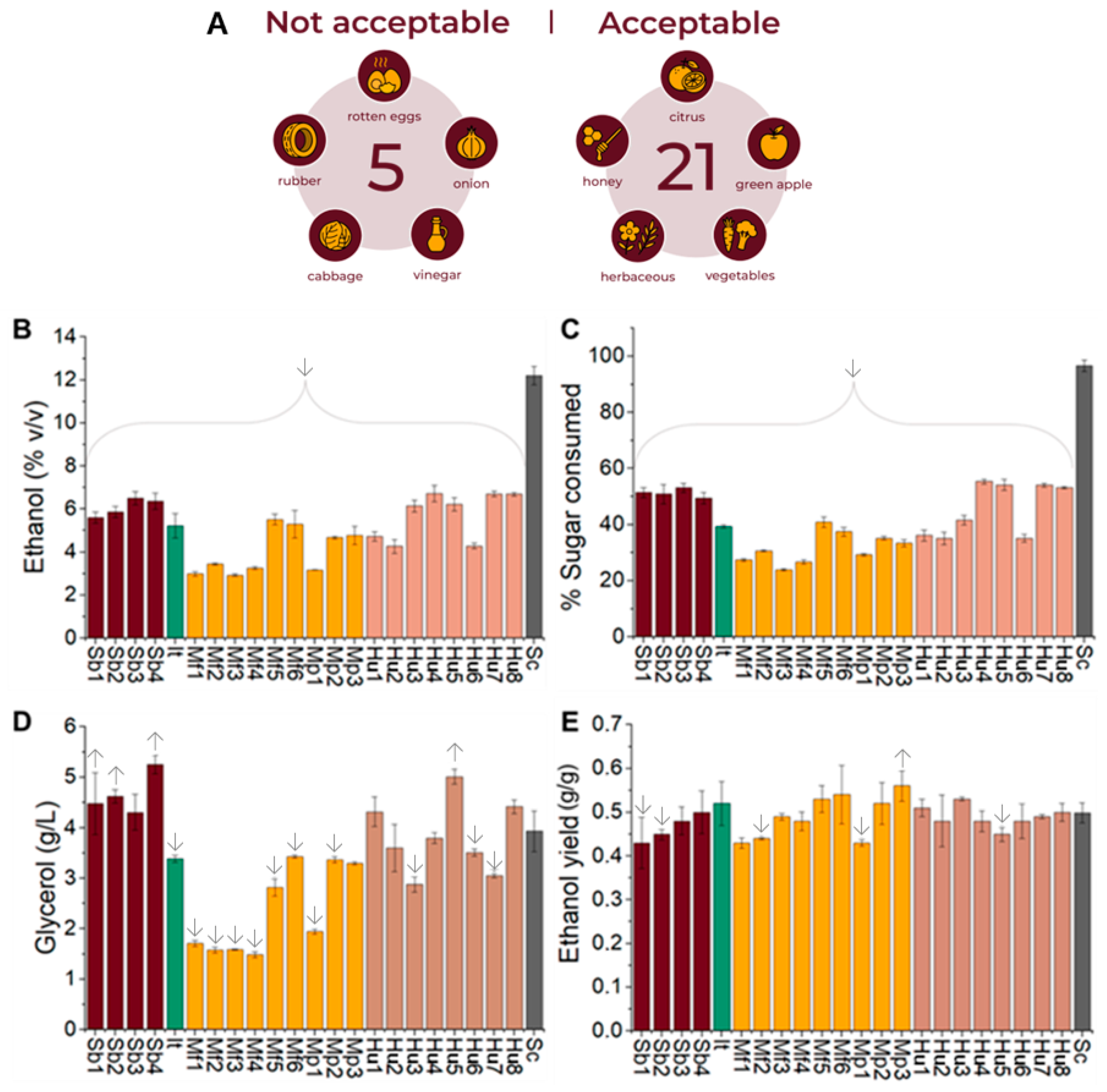 - Ciani, M.; Morales, P.; Comitini, F.; Tronchoni, J.; Canonico, L.; Curiel, J.A.; Oro, L.; Rodrigues, A.J.; Gonzalez, R. Non-Conventional Yeast Species for Lowering Ethanol Content of Wines. Front. Microbiol. 2016, 7, 642. [Google Scholar] [CrossRef]