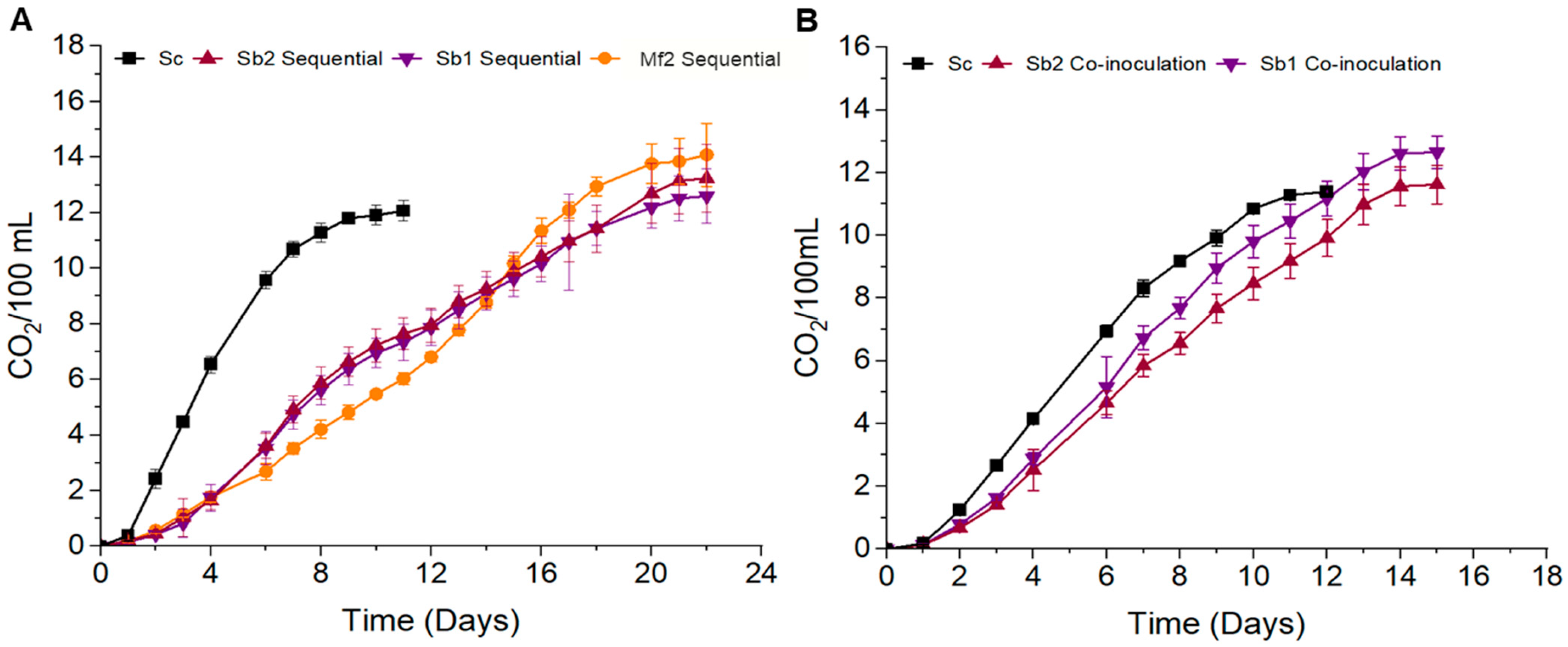 | Sequential | Sb1 + Sc | NS: 1 × 106 | At 48 h: 50 mg N/L DAP + 50 mg N/L AAs + DAP; 2.5 mg/L yeast extract; 0.3 mg/L thiamine |