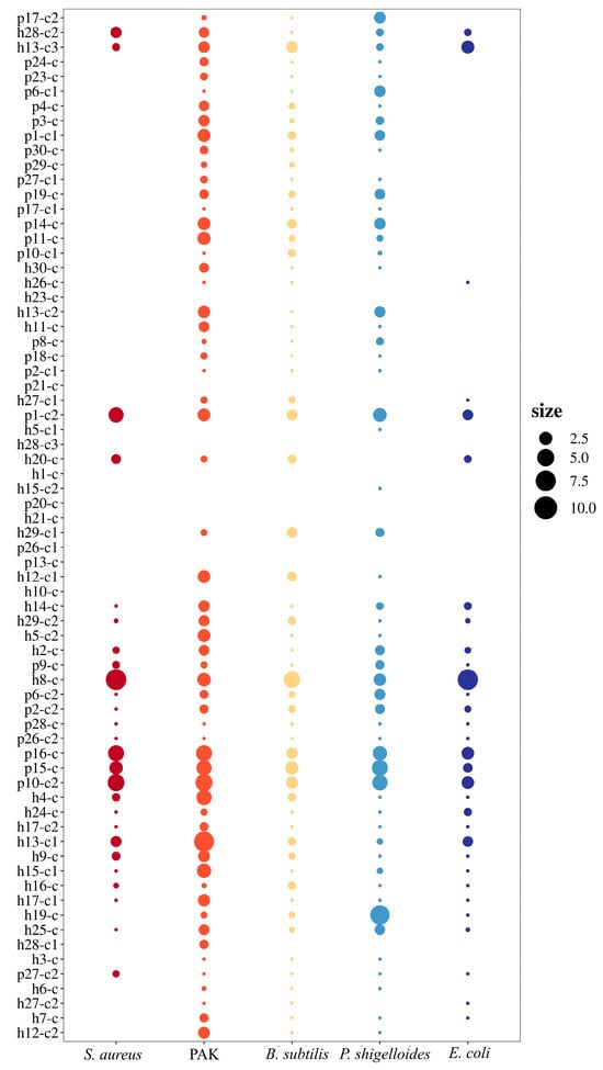 Lactic acid at the same pH was used as the control, and the antibacterial zones formed by LAB on the dual-culture medium was larger than those formed by the controls, indicating antibacterial activity against the indicator bacteria. Among the 70 LAB strains, they showed substantial variability in their inhibitory effects against five indicator strains: S. aureus, B. subtilis, PAK, P. shigelloides, and E. coli. Focusing on the five high-biofilm-producing strains (h8-c, p10-c2, p15-c, p16-c, and p1-c2), their suspension all exhibited broad-spectrum inhibitory activity against the tested pathogens (Figure 3), confirming that the antibacterial effect was mediated by soluble metabolites in the supernatant. The size of the bubbles in Figure 3 represents the ratio of inhibition zone diameters formed by the LAB supernatant to that formed by the pH-adjusted MRS control (matched to the LAB supernatant’s pH to exclude pH-driven effects). The larger bubbles indicate stronger specific antibacterial activity, while ratios close to 1 indicate minimal specific activity. Based on inhibition zone measurements, h8-c and p15-c demonstrated the strongest antimicrobial efficacy against all five indicator strains. Due to their superior antimicrobial performance and high biofilm-forming capacity, strains h8-c and p15-c were selected for subsequent animal experiments.