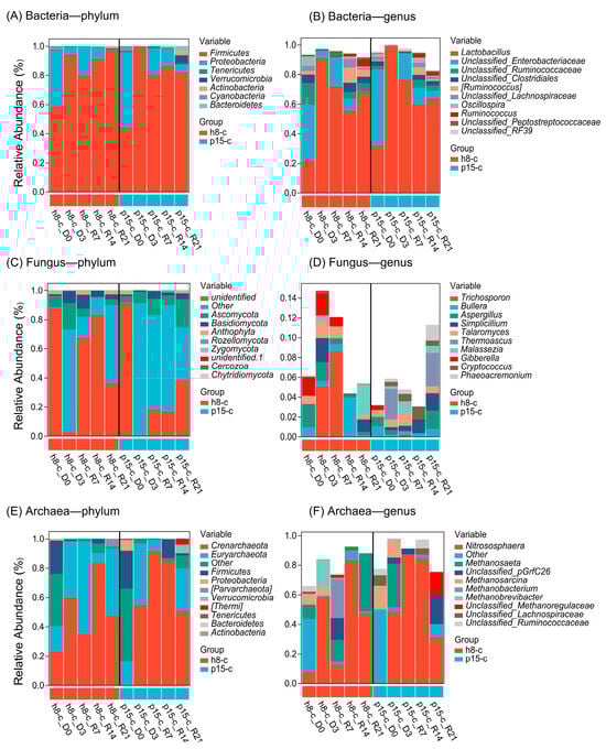 Relative abundance of bacteria, fungi, and archaea in the gut microbiota. (A) bacterial community composition at the phylum level; (B) bacterial community composition at the genus level; (C) fungal community composition at the phylum level; (D) fungal community composition at the genus level; (E) archaeal community composition at the phylum level; (F) archaeal community composition at the genus level. Five time points: D0, day before the administration period; D3, day 3 of the administration period; R7, day 7 of the recovery period; R14, day 14 of the recovery period; R21, day 21 of the recovery period.