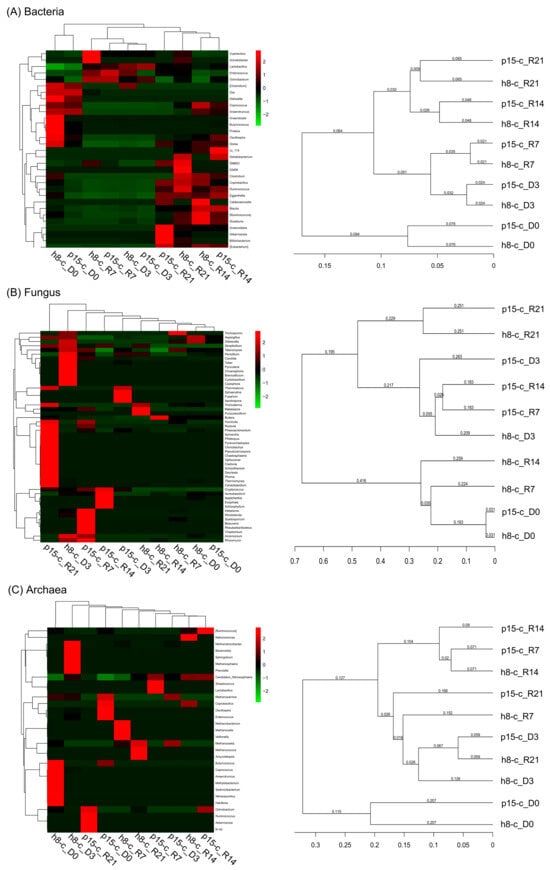 Based on the abundance of the top 50 genera, cluster analysis revealed distinct microbial profiles, visualized in a heatmap; additionally, UPGMA clustering of Weighted UniFrac distances illustrated the phylogenetic relationships among samples. As shown in Figure 5, Lactobacillus supplementation induced distinct temporal trajectories in bacterial, fungal, and archaeal communities. In the bacterial heatmap (panel A), the two groups exhibited high similarity at the baseline (D0); immediately after probiotic administration (D3 and R7) their profiles remained closely related, whereas the late recovery phase (R14 and R21) again formed coherent clusters. The corresponding dendrogram mirrored this pattern, indicating that probiotic feeding substantially reshaped the cecal bacterial assemblage, with D0 samples being the most dissimilar to all subsequent time points. Fungal similarities (panel B) were markedly lower, high values (>0.90) were restricted to consecutive sampling intervals within the same treatment. Notably, p15-c_D3 clustered tightly with all subsequent recovery samples (R7, R14, R21), whereas h8-c_D3 displayed a more variable relationship with its own recovery series, implying that the p15-c mycobiota stabilised rapidly post-intervention, whereas the h8-c fungal community remained more dynamic. Archaeal profiles (panel C) followed a clear “treatment-by-time” structure: all p15-c recovery specimens first coalesced with p15-c_D3 and only then joined the p15-c_D0 branch; h8-c samples likewise grouped chronologically, while the inter-treatment boundary was sharply defined, underscoring the high specificity and temporal continuity of archaeal responses to Lactobacillus administration. Collectively, the hierarchical clustering demonstrates that bacteria are most responsive to treatment grouping, fungi exhibit the greatest variability, and archaea display pronounced temporal persistence coupled with treatment-specific divergence.