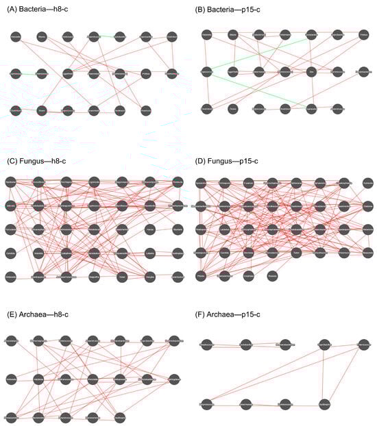 Spearman’s rho was calculated among the top 50 dominant genera based on abundance, and correlation networks were constructed for those filtered dominant genera with rho > 0.6 and a p-value < 0.01. Figure 6 displays the microbial co-occurrence networks constructed based on 16S/ITS sequencing data, which illustrate the interrelationships among microbial members across bacterial, fungal, and archaeal communities in the h8-c and p15-c groups, respectively. In the networks, OTUs (97% similarity) represent nodes, with red edges representing positive correlations and green edges representing negative correlations.