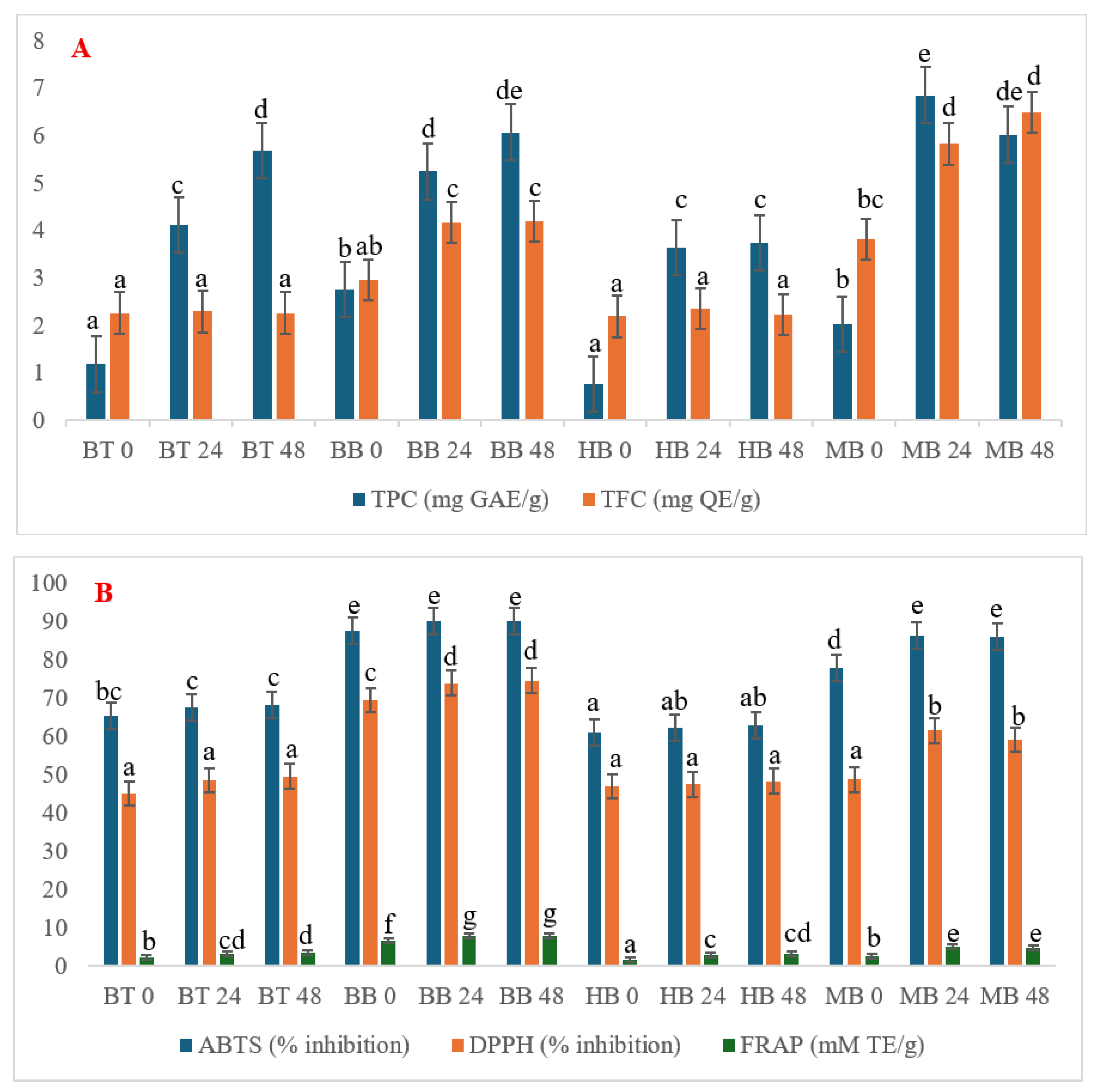 3.4.2. Targeted Phenolic Compounds of Fermented Legume Flours Using Ultra-High Performance Liquid Chromatography–Photodiode Array