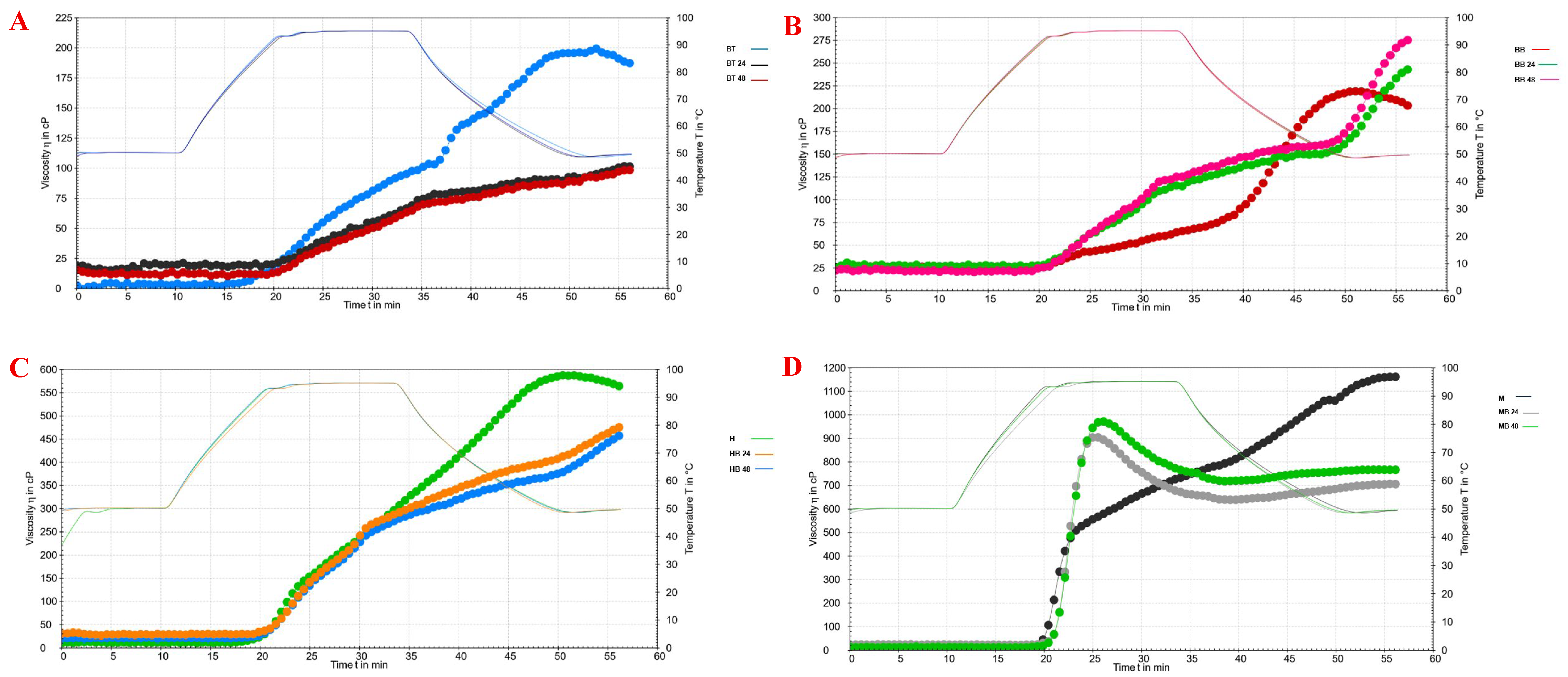 - Mauro, R.R.; Vela, A.J.; Ronda, F. Impact of starch concentration on the pasting and rheological properties of gluten-free gels. Effects of amylose content and thermal and hydration properties. Foods 2023, 12, 2281. [Google Scholar] [CrossRef]