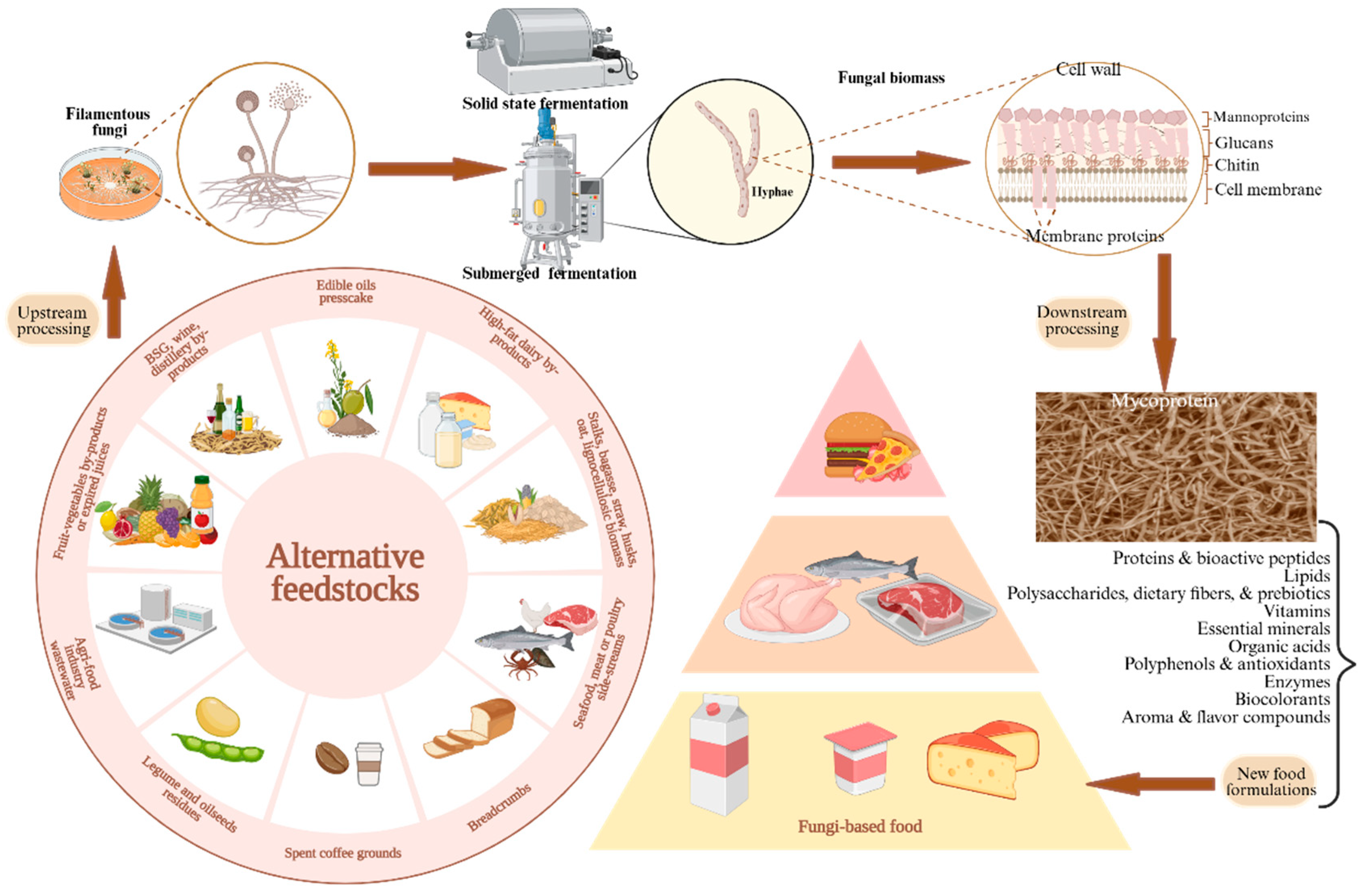- Khatami, K.; Qazanfarzadeh, Z.; Jiménez-Quero, A. Fungal fermentation: The blueprint for transforming industrial side streams and residues. Bioresour. Technol. 2026, 440, 133426. [Google Scholar] [CrossRef] [PubMed]