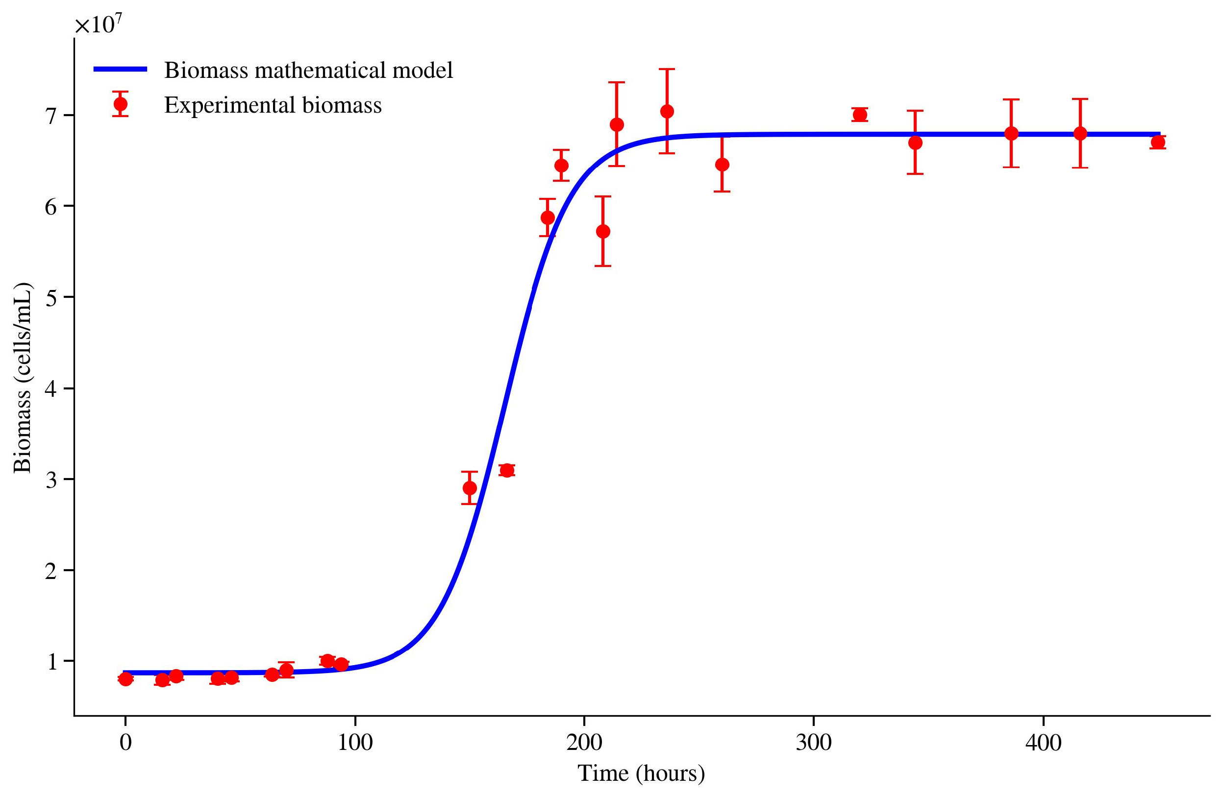 During the initial (lag) phase, the experimental measurements lie both below and above the model prediction. This behavior can be explained, at least in part, by the experimental uncertainty associated with sample dilution and cell counting, which may lead to inaccurate biomass estimates. From approximately 125 h onward, the experimental trend follows the logistic dynamics more closely. The fitted model estimates Xmin = 7.465 × 106 cells/mL and an asymptotic plateau of Xmax = 6.783 × 107 cells/mL, and an inflection time of t0 = 168.4 h. After ≈210 h, both the experimental data and the model approach a stationary regime near Xmax. Overall, the fit yields an RMSE of 3.33 × 106 cells/mL, indicating good agreement outside the lag region.