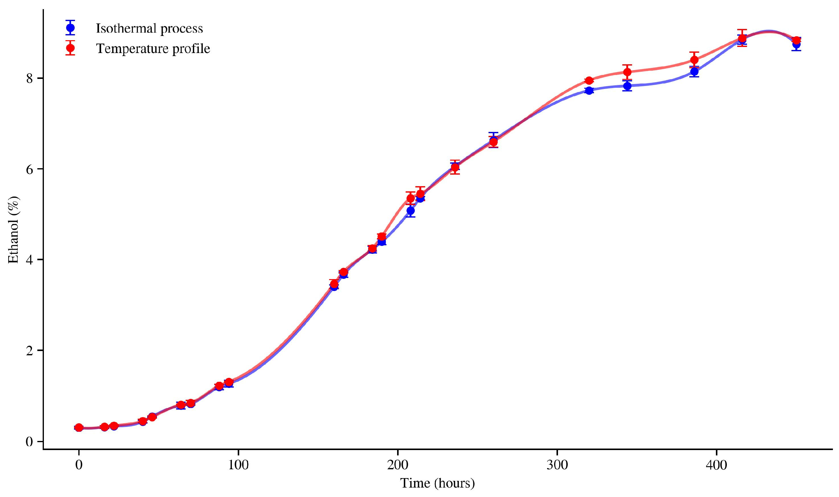 Figure 5 shows that both the isothermal fermentation (10 °C) and the fermentation carried out under a temperature profile lead to practically the same final ethanol concentration, as the curves converge toward the plateau region at the end of the process. Therefore, no significant difference in the final alcohol content is observed between the two operating conditions.
