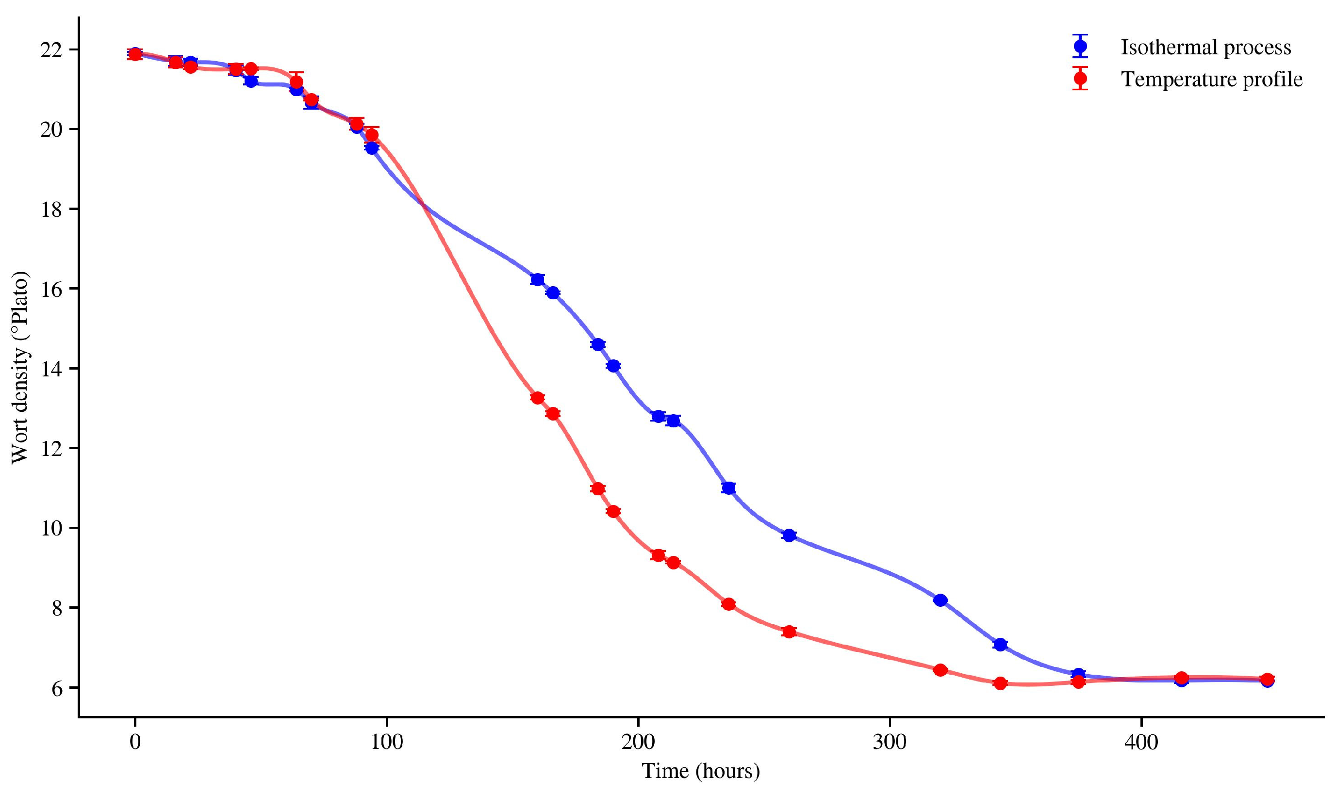 Figure 6 shows the evolution of wort density during fermentation under an isothermal process and using a temperature profile, as wort density measurement provides an indicator for identifying the onset of the stationary fermentation regime and is less sensitive to experimental errors than biomass counting or direct ethanol measurements [