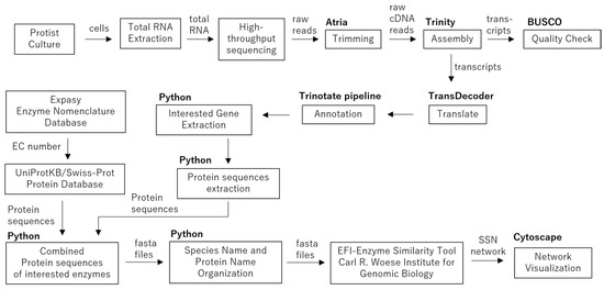 In silico workflow from protist cell culture to Sequence Similarity Network (SSN) analysis. Squares represent major analytical steps, while bold labels outside each square denote the software or tools used. Arrows indicate the direction of data flow, with accompanying text specifying the type of data transferred between steps.