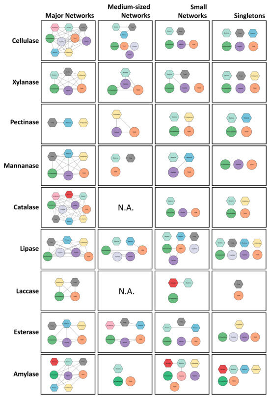Accordingly, the percentage of protist-derived nodes per network size, when compared to the baseline, indicates whether protist sequences preferentially occupy smaller networks. Enrichment of protist-derived nodes in small networks and/or singletons relative to baseline supports higher novelty potential, as seen for cellulase (61.2% overall vs. 80.2% in small networks), mannanase (53.2% vs. 100% in singletons), catalase (56.0% vs. 72.2% in small and 75% in singletons), laccase (31.9% vs. 50% in small), and amylase (56.6% vs. 81.5% in medium-sized). Conversely, reduced protist representation in major networks (e.g., esterase: 70.8% overall vs. 30.6% in major networks) suggests protist sequences are shifted toward smaller networks, which is favorable for mining.