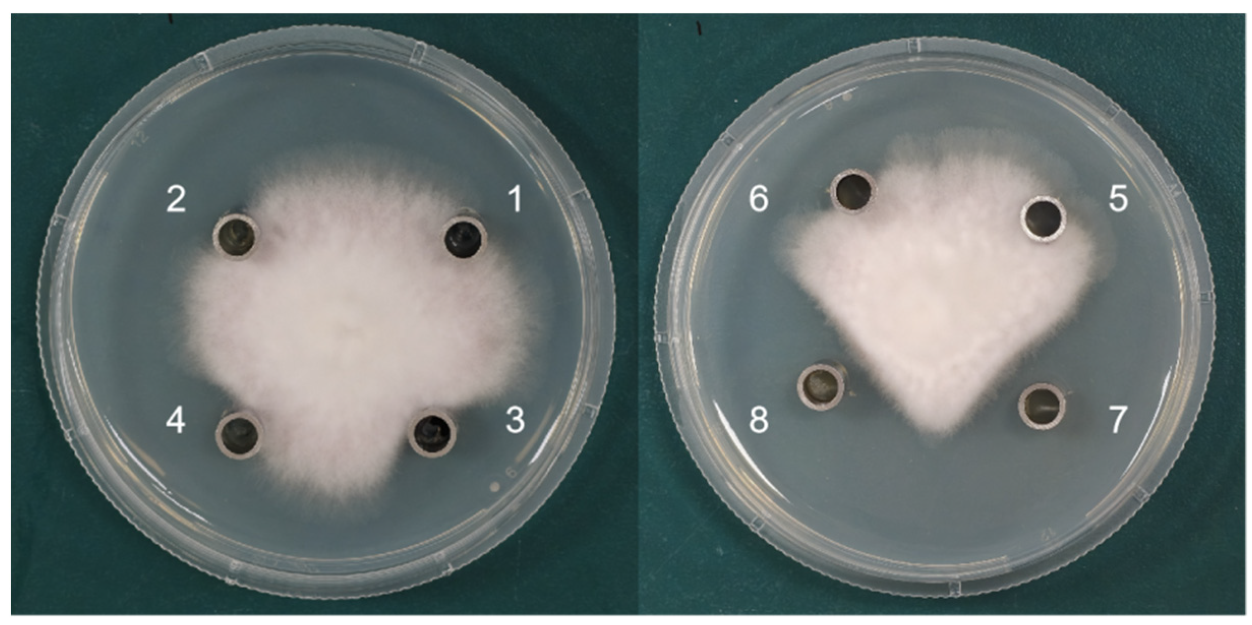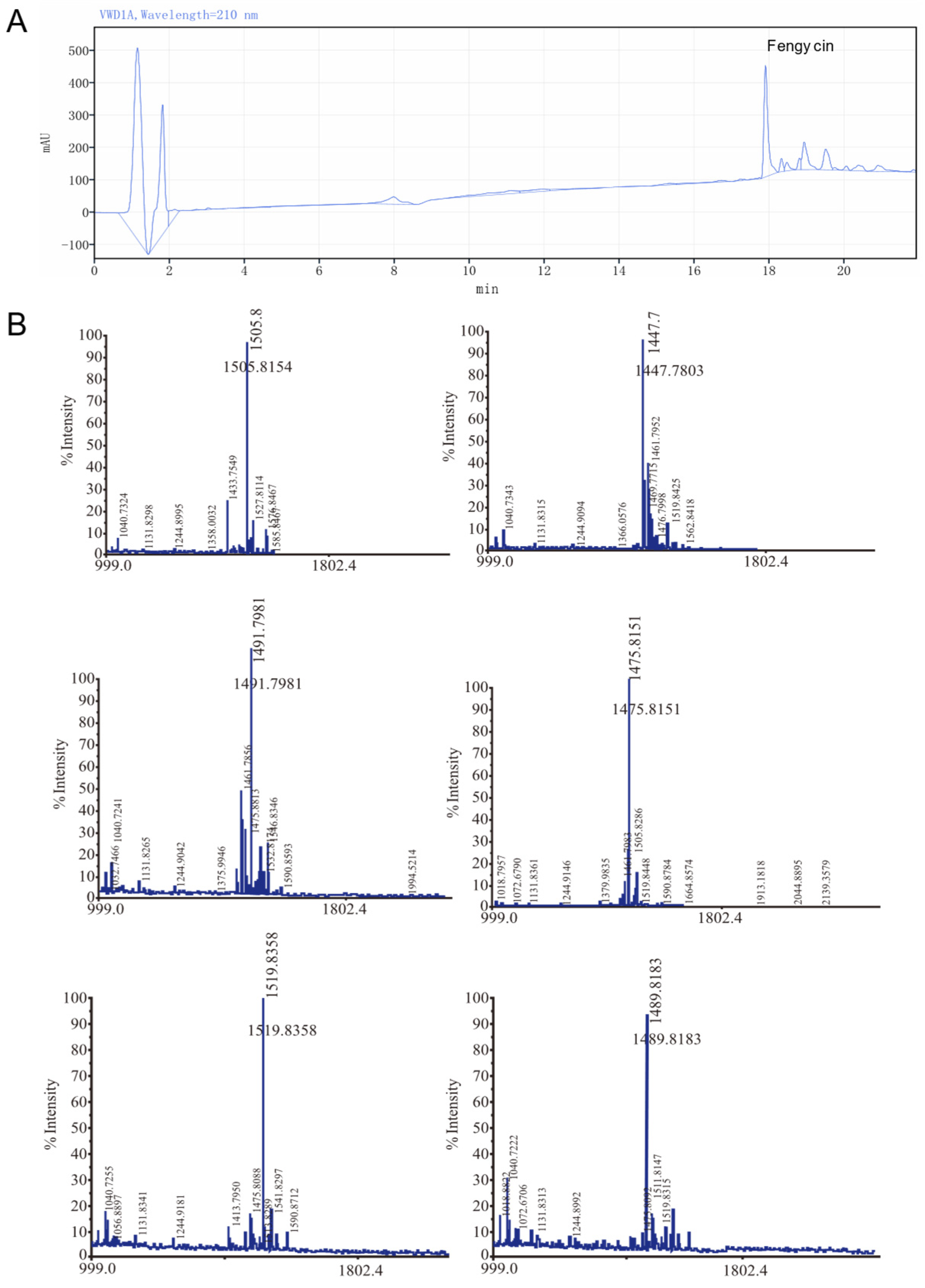 3.1. Identification of Fengycin Production in the Strain and Its Inhibitory Effect on Crop Pathogenic Fungi