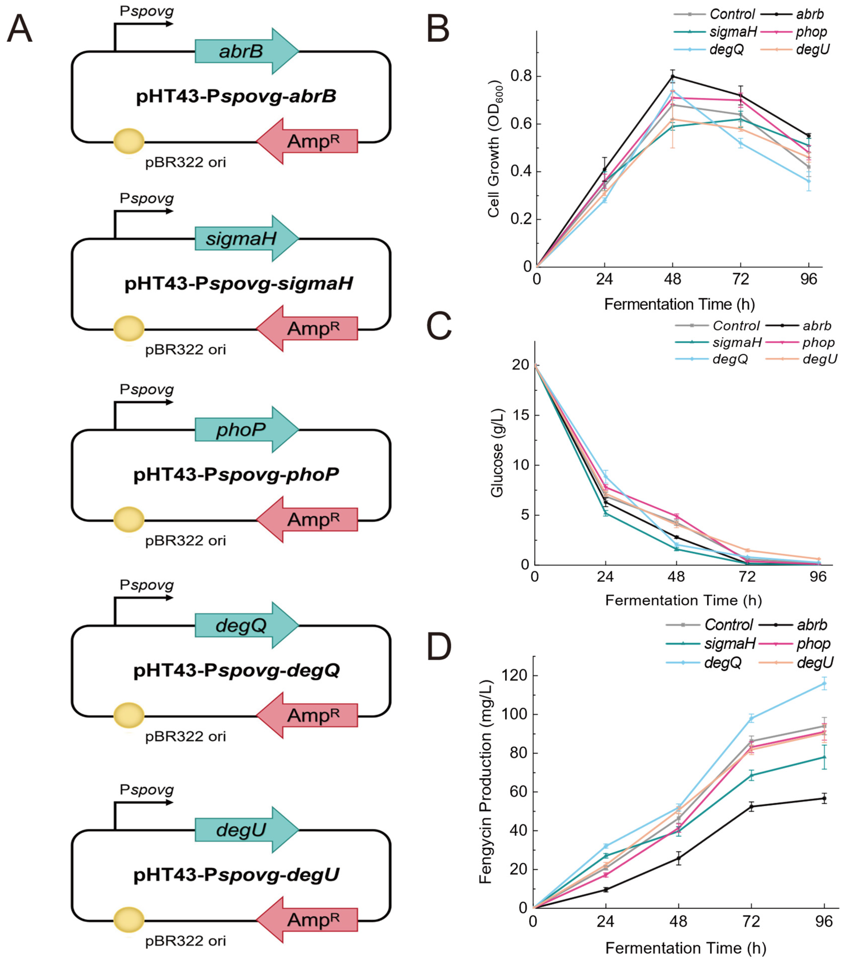 3.3. Effect of Overexpression of Global Regulatory Factors on Fengycin Synthesis Level