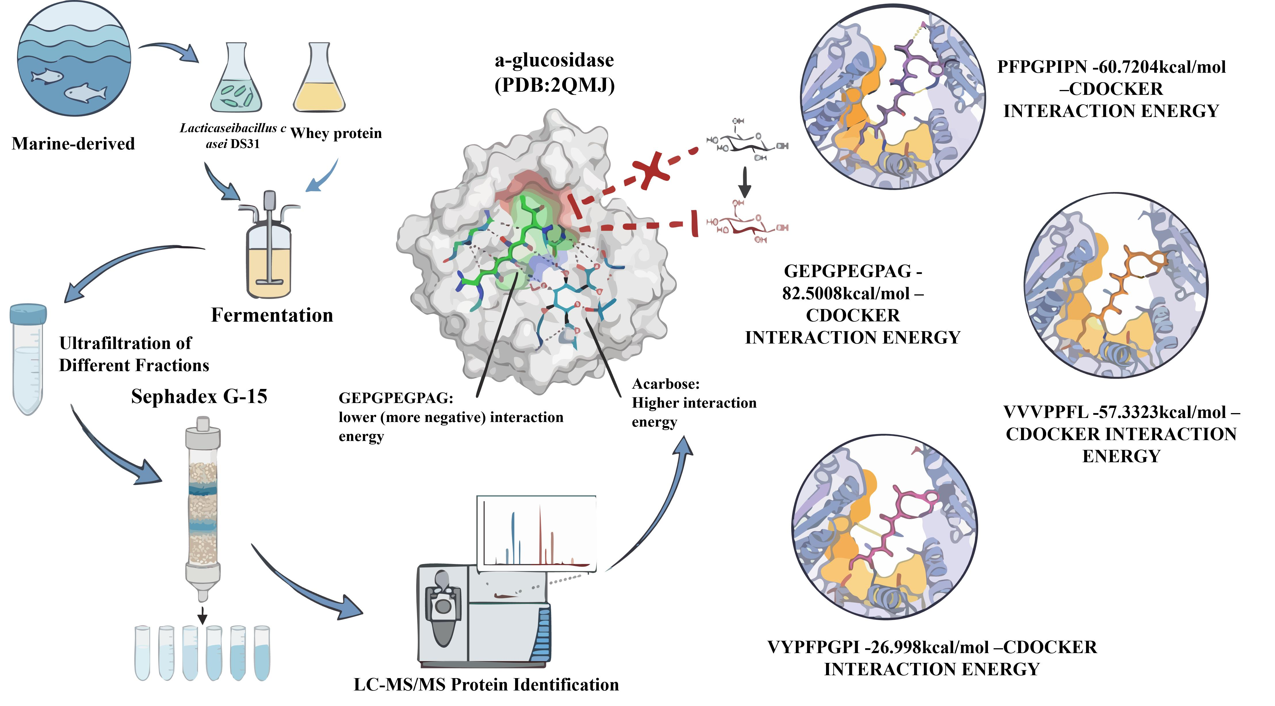 - Hau, E.H.; Huang, W.; Huang, L.; Zeng, X.; Huang, Z.; Dan, X.; Fan, X.; Mah, S.H.; Li, L. Antidiabetic Potential of Buffalo Milk Casein Hydrolysates through Enzymatic Hydrolysis and Bioactive Peptide Identification as α-Glucosidase Inhibitors. Food Chem. 2025, 493, 145780. [Google Scholar] [CrossRef] [PubMed]